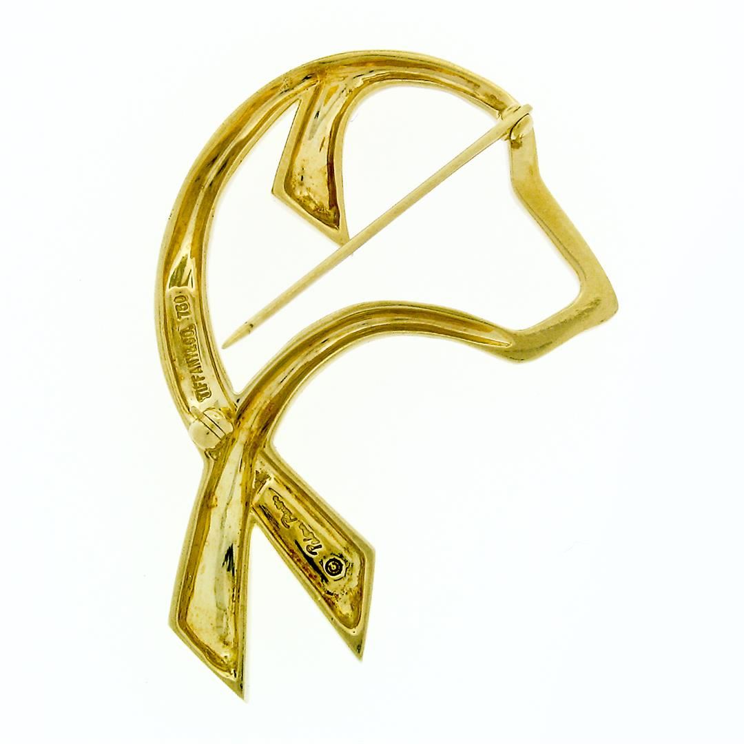 An authentic, vintage, Tiffany & Co. solid 18k yellow gold graffiti open dog ribbon brooch. Measures 48.00x36.15mm and weighs a total of 14.83 grams.