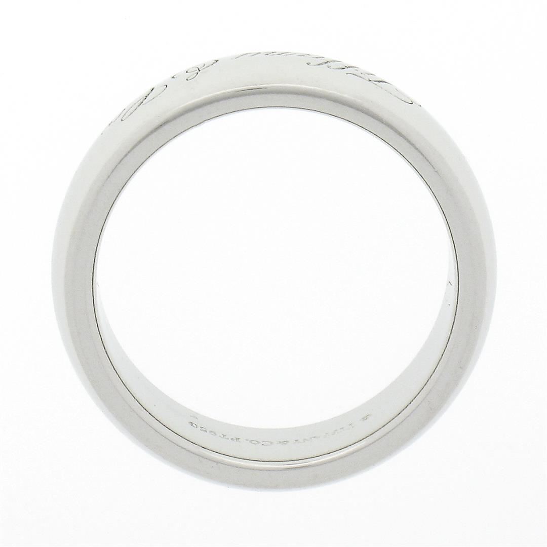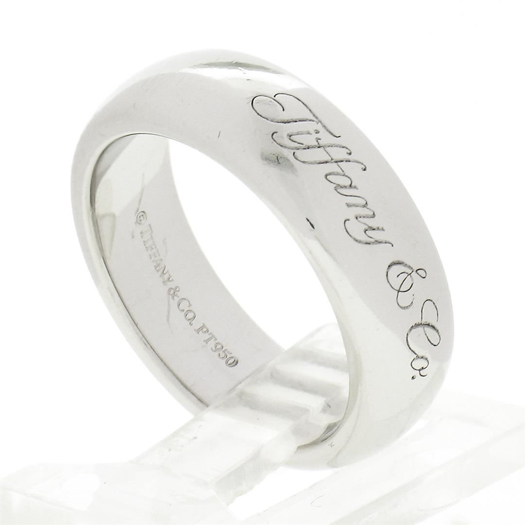 A solid platinum band ring by tiffany & co. The ring is size 5.5, weighs a total of 12.65 grams, and measures 5.85mm wide.