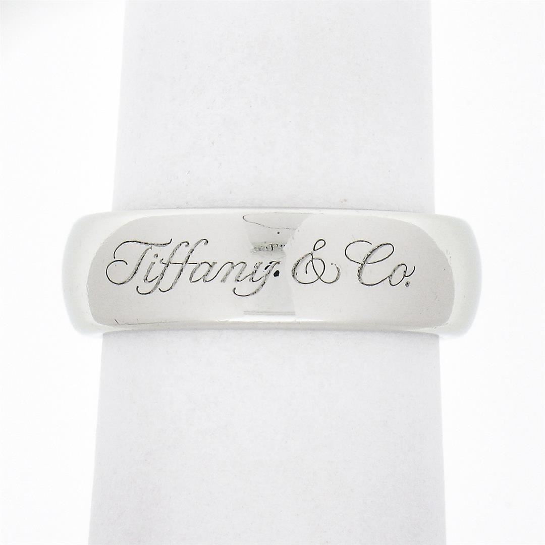 A solid platinum band ring by tiffany & co. The ring is size 5.5, weighs a total of 12.65 grams, and measures 5.85mm wide.