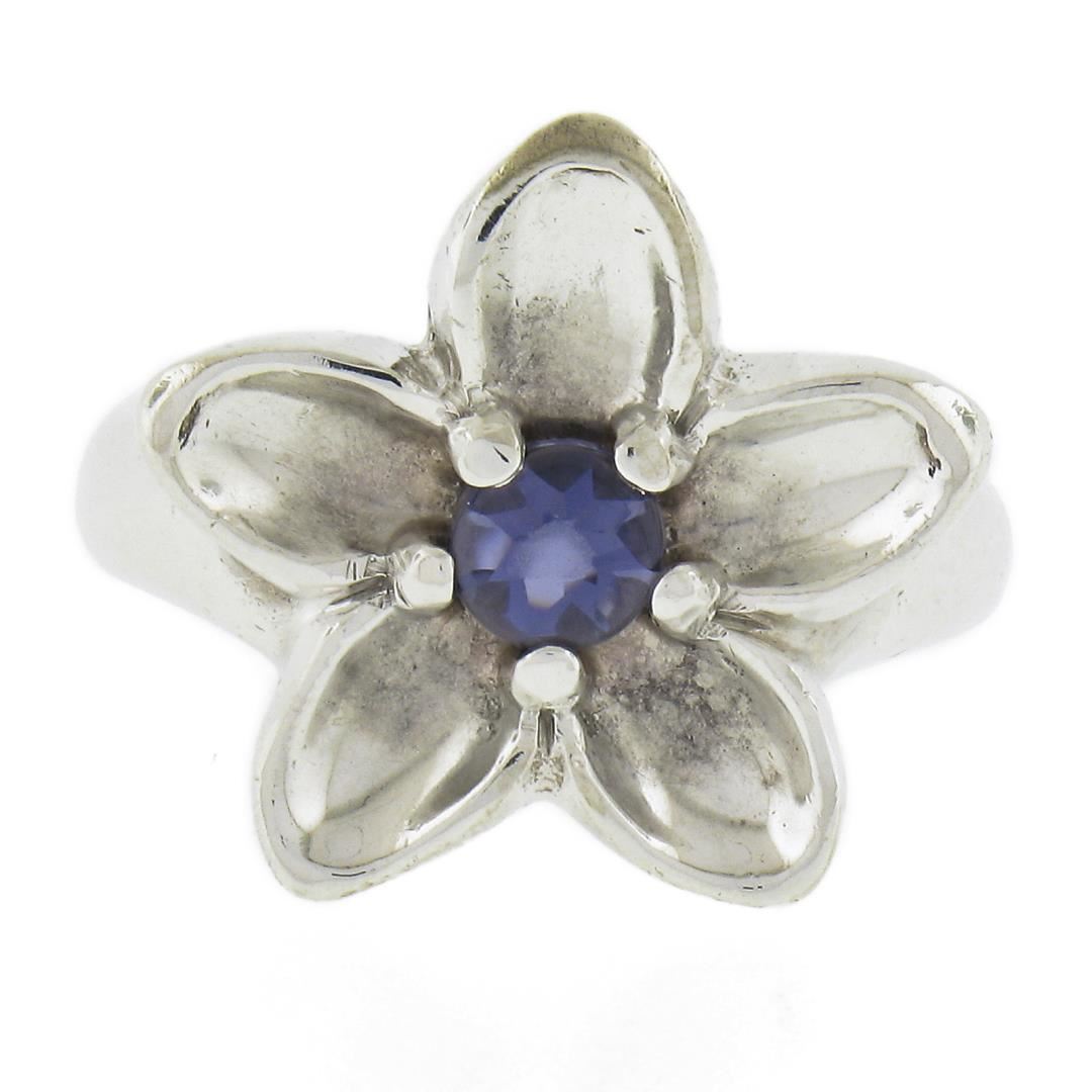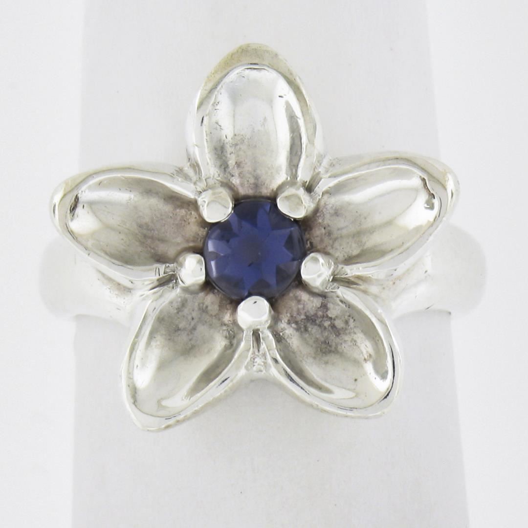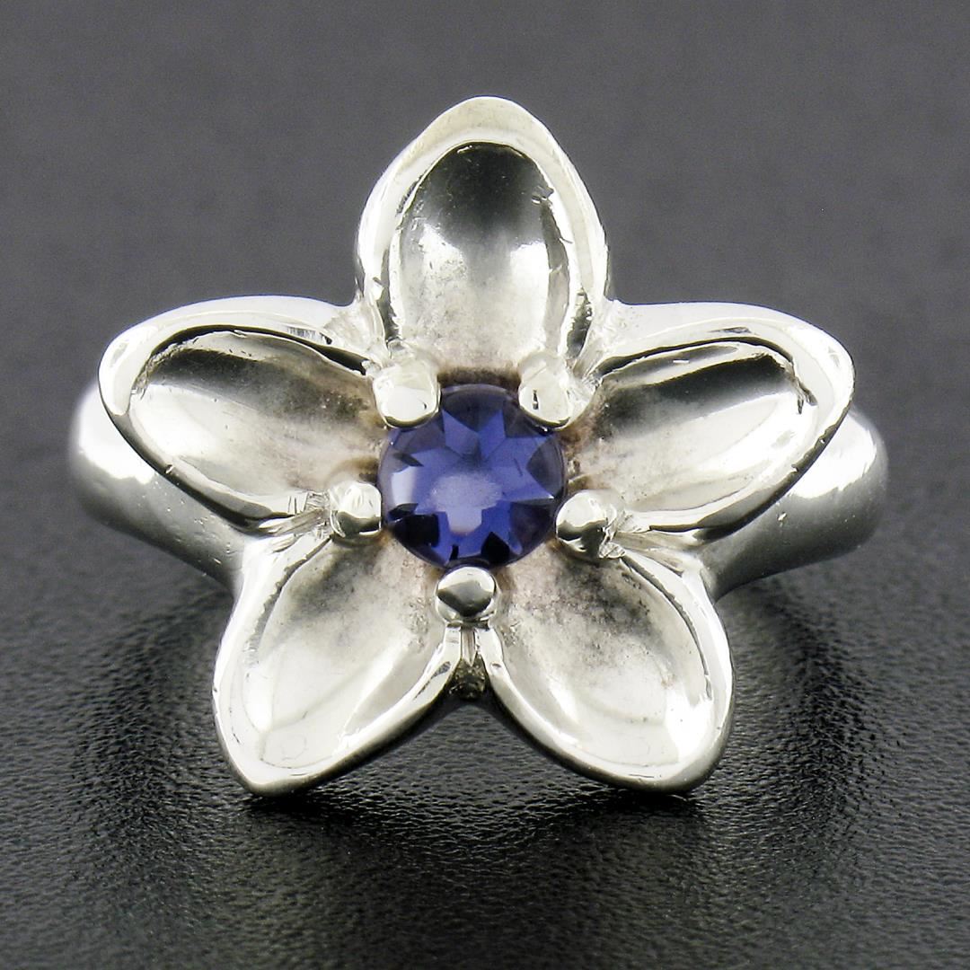 A solid silver flower ring by Tiffany & Co. with 1 round cut natural iolite (3.7mm). The ring is size 4.0, weighs a total of 5.29 grams, and measures 15.6mm wide.