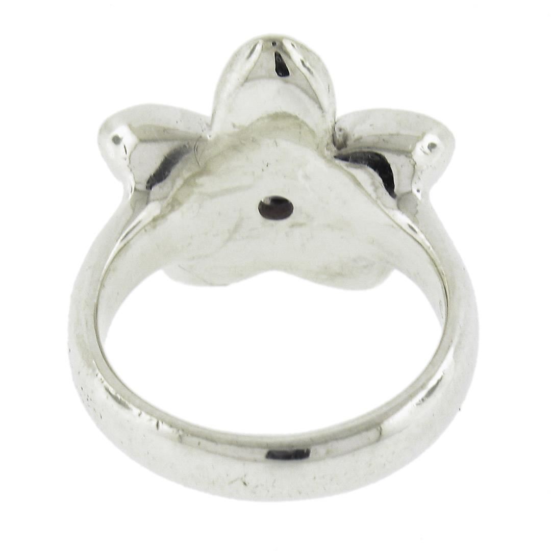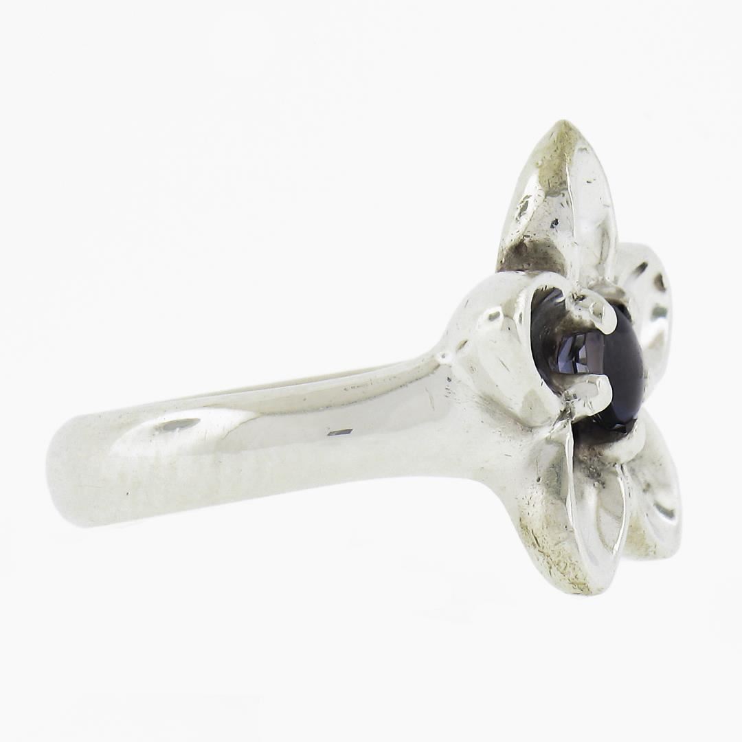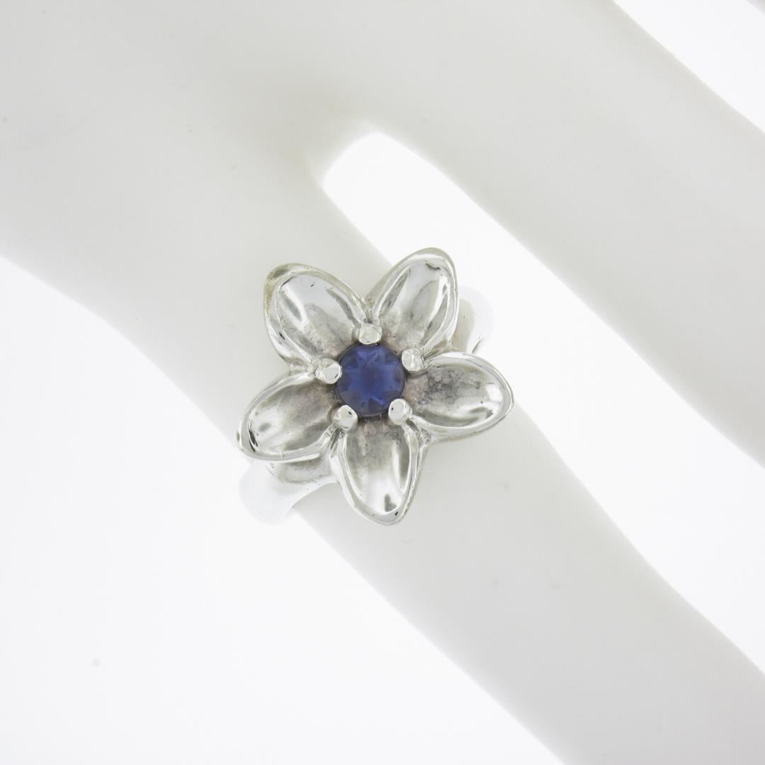 A solid silver flower ring by Tiffany & Co. with 1 round cut natural iolite (3.7mm). The ring is size 4.0, weighs a total of 5.29 grams, and measures 15.6mm wide.