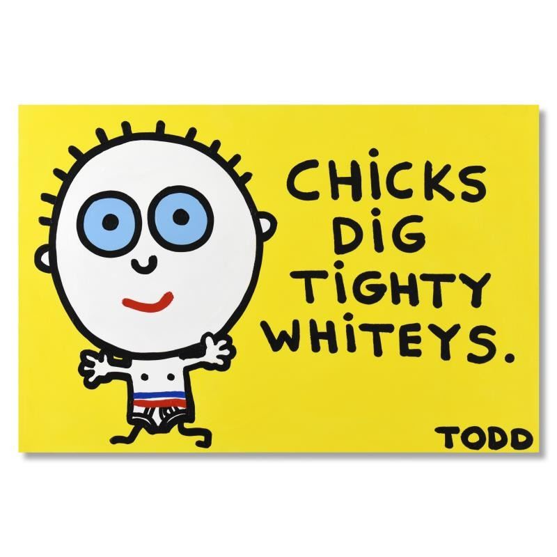 "Tighty Whities" is an original acrylic painting on canvas by Todd Goldman, hand signed by the artist. This piece comes gallery wrapped. Includes Letter of Authenticity. Measures approx. 36" x 24" (image). ** Please note: There is wear on the corners and