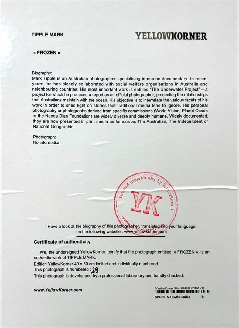 Tipple Mark Frozen YellowKorner Certified Photograph. Certificate of Authenticity from YellowKorner affixed to the back. Matted Dimensions 16"x20". Protected with Clear Mylar Sleeve.