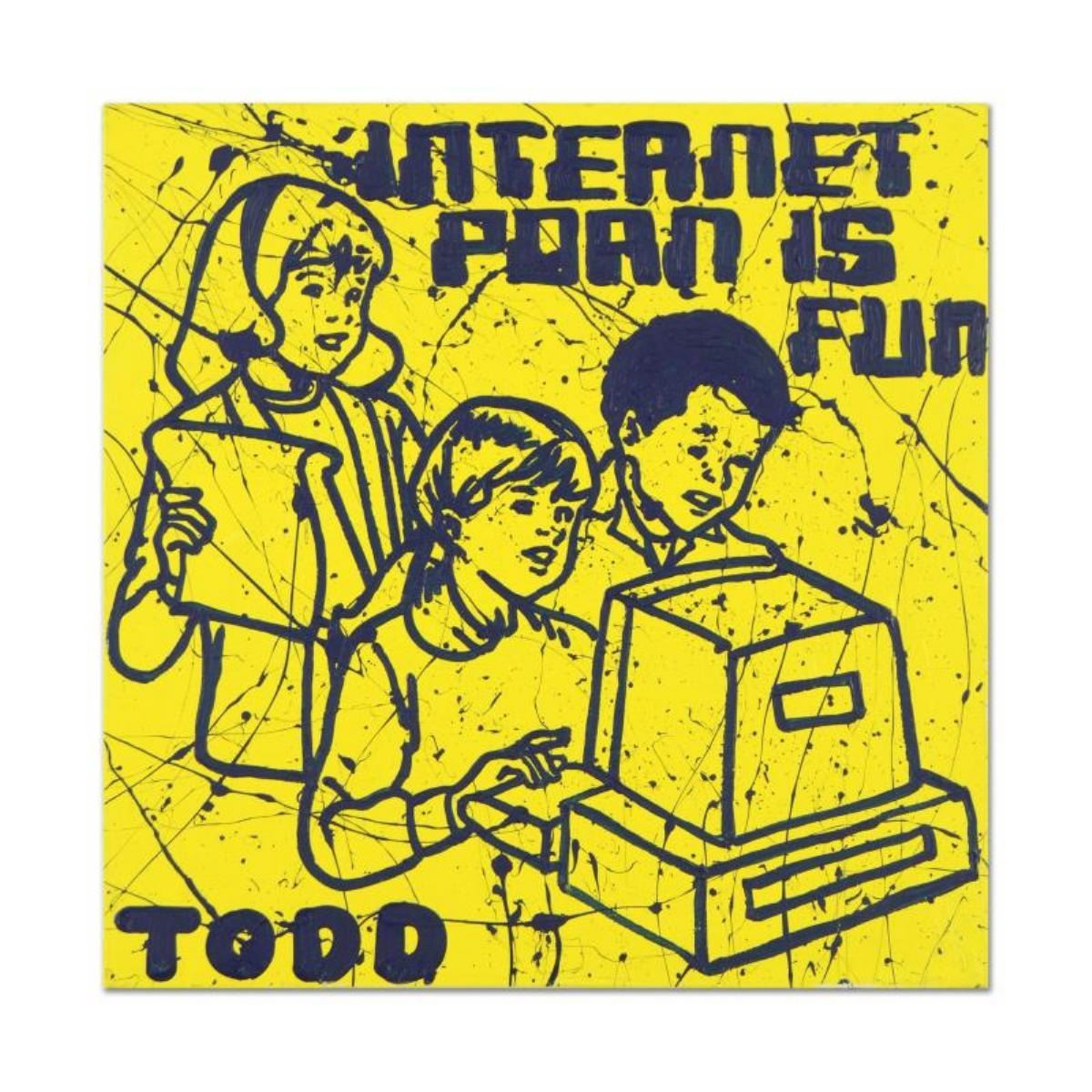 We acquired this piece as part of a larger collection. We do not approve of its inappropriate content. "Internet Porn" is an original acrylic painting on canvas by Todd Goldman, hand signed by the artist. This piece comes gallery wrapped. Includes Certificate of Authenticity. Measures approx. 24" x 24" (image). Please note: There is wear on the corners and edges of this piece.