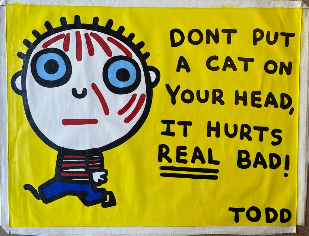 Todd Goldman "Cat on Head" Hand Signed Original Acrylic on Canvas Dimensions: 36 x 48 Inches