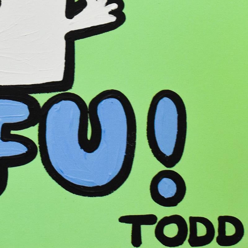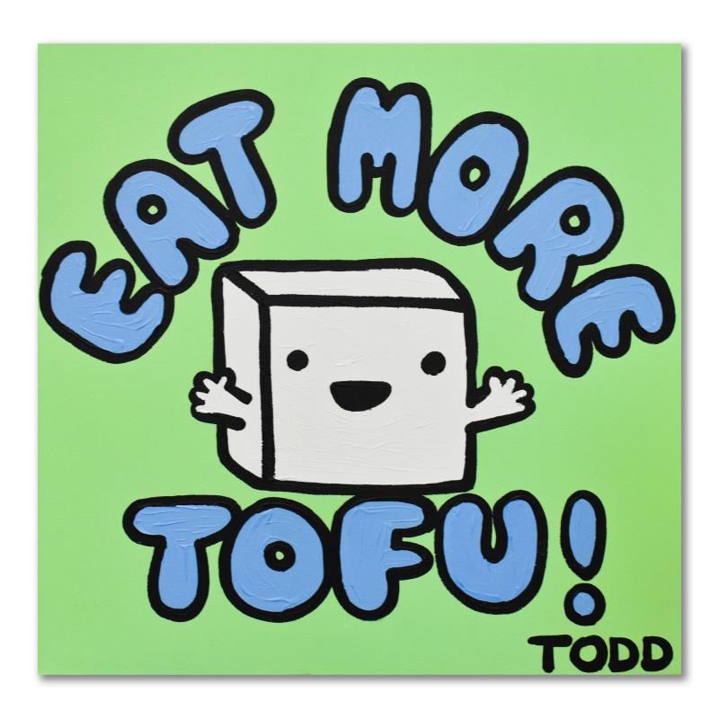 "Tofu" is an original acrylic painting on canvas by Todd Goldman, hand signed by the artist. This piece comes gallery wrapped. Includes Letter of Authenticity. Measures approx. 30" x 30" (image). Please note: There is wear on the corners and edges of this piece.