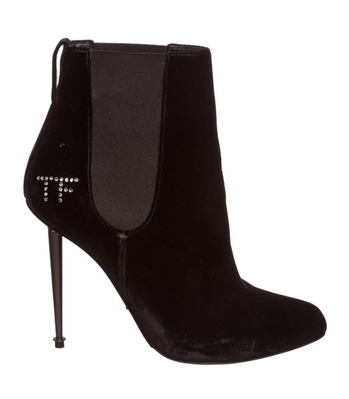 Black velvet Tom Ford Spiked boots with crystal TF logo embellishment.