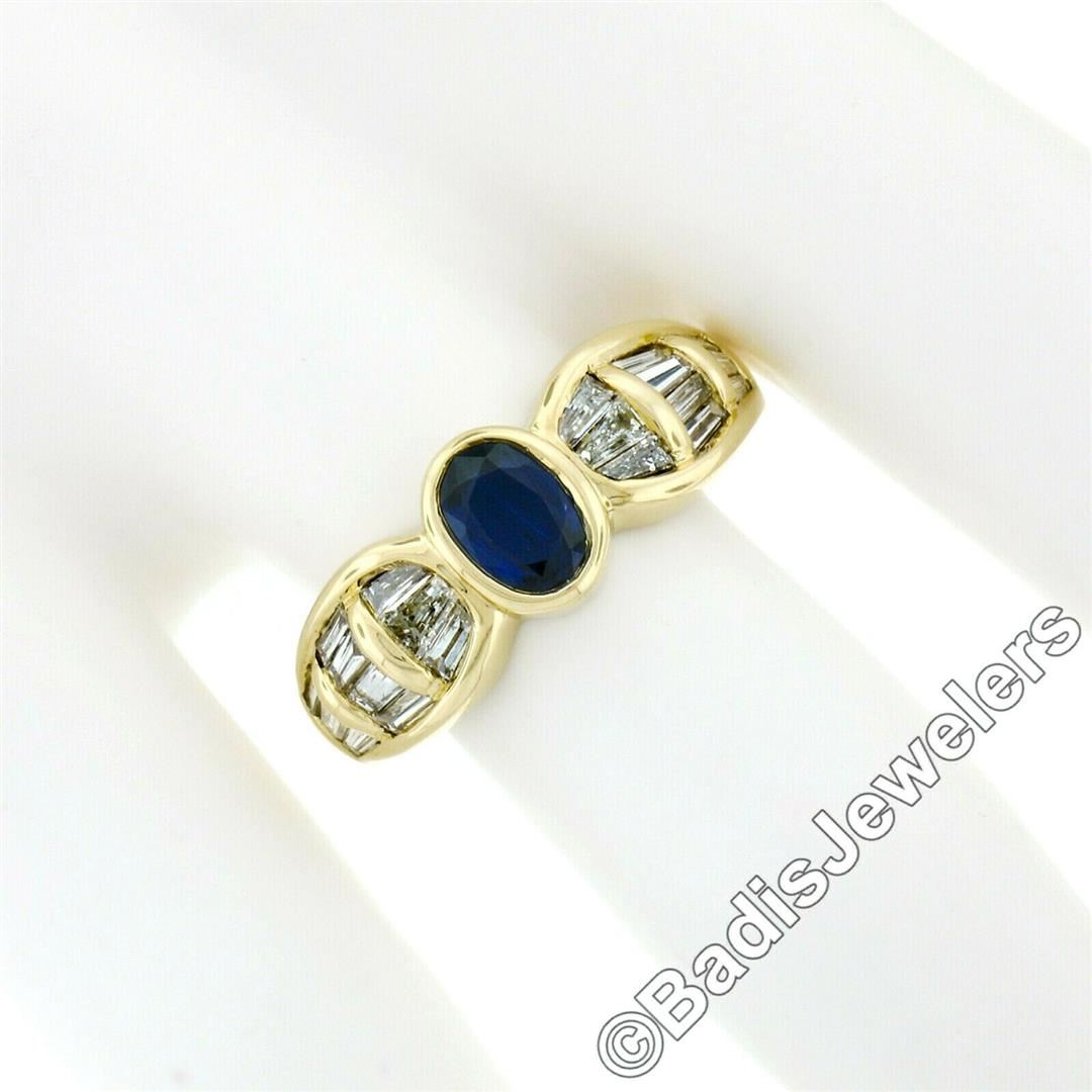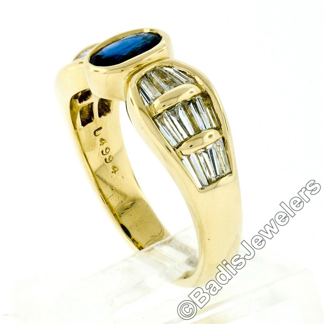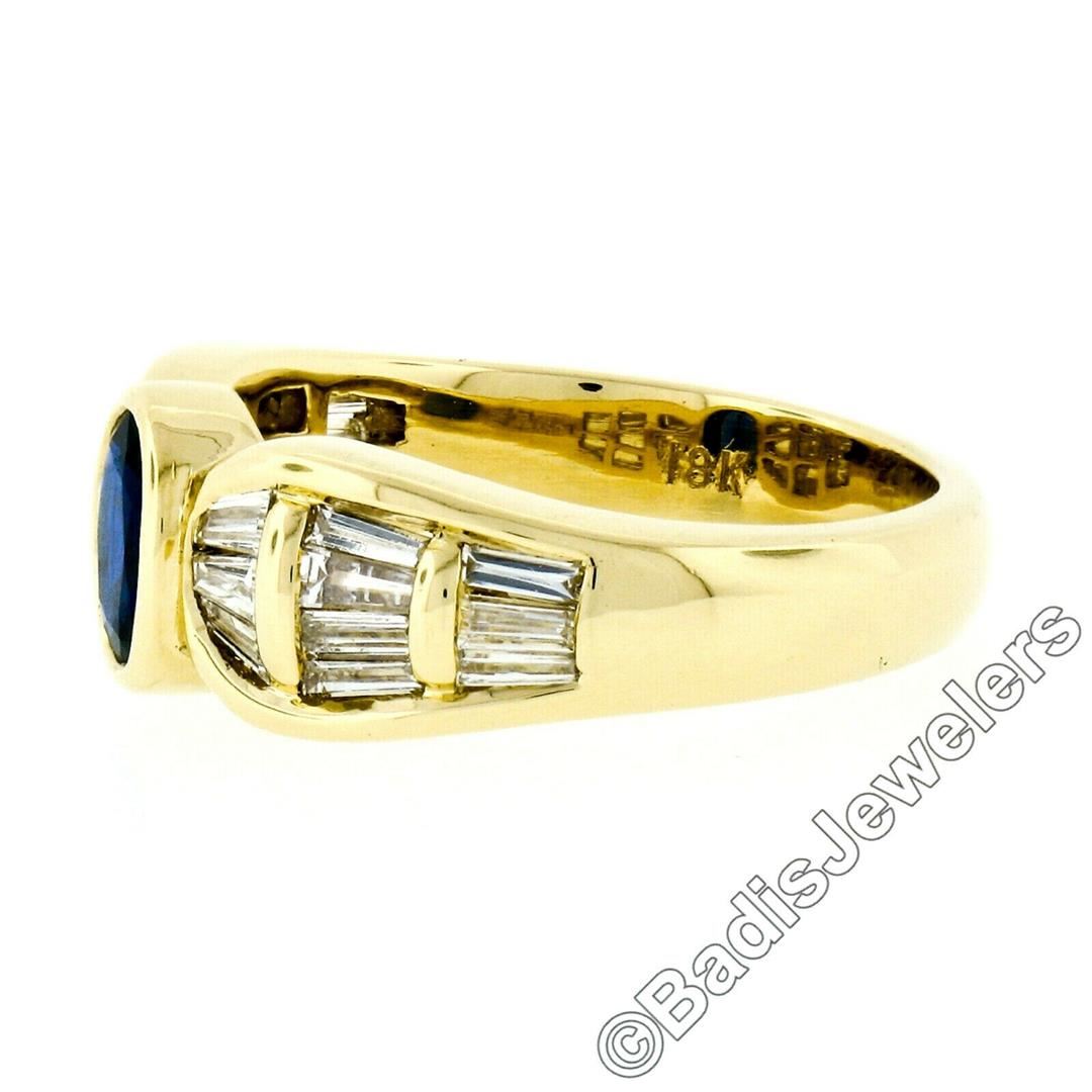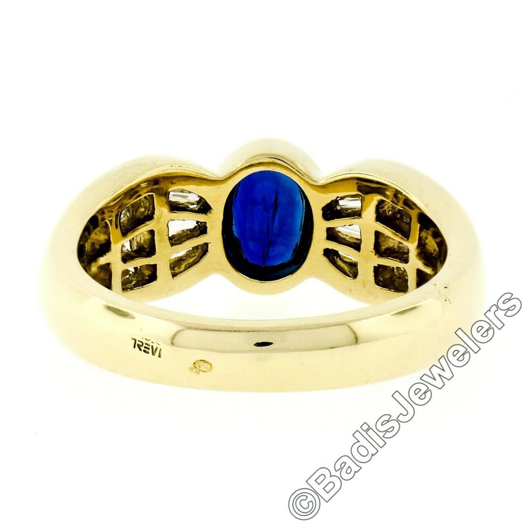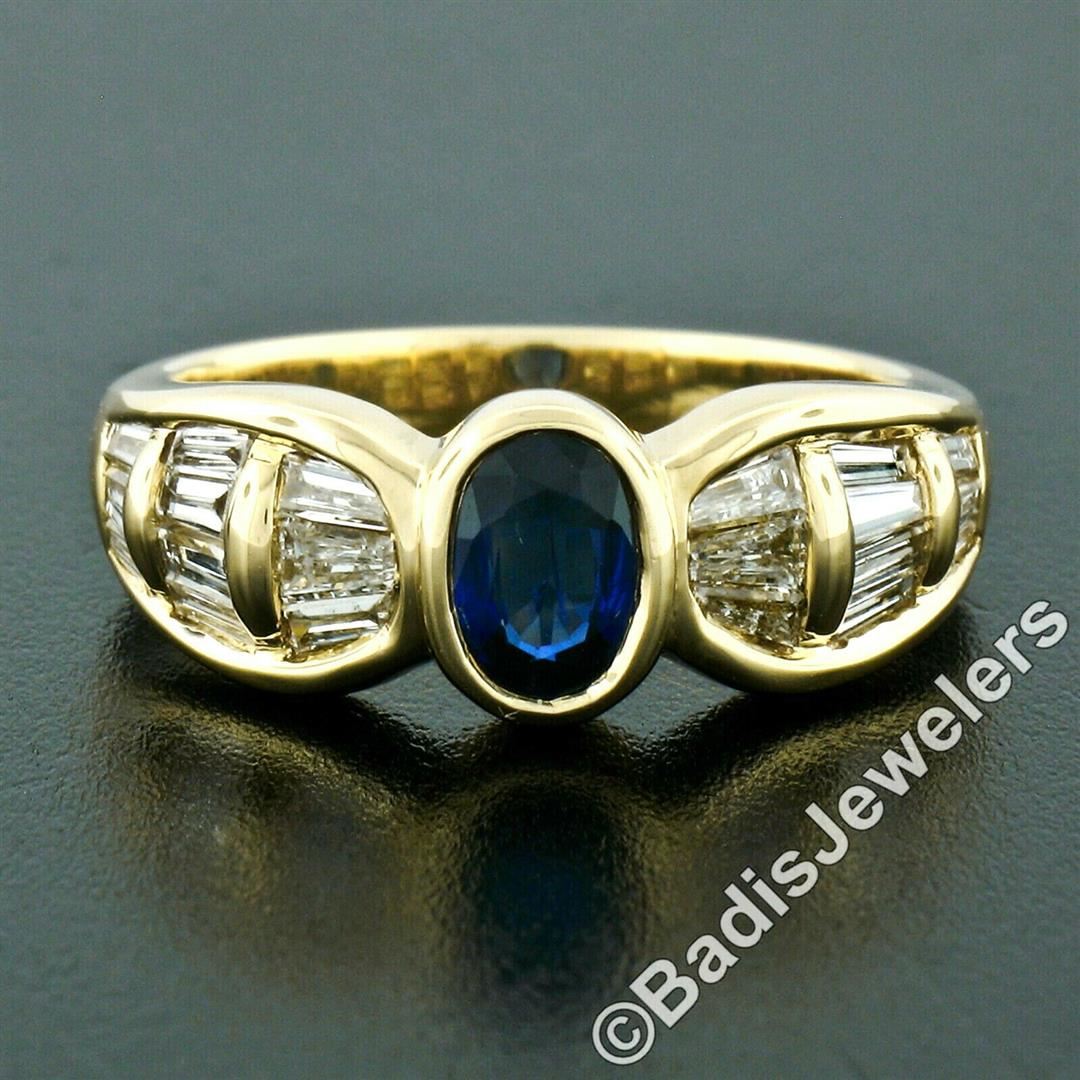 An 18kt yellow gold ring made by Trevi featuring an oval cut blue sapphire (0.80ct) and 20 baguette cut diamonds (H/I - VS1/VS2; 1.10ctw). The ring is size 7.5, weighs a total of 7.46 grams, and measures 7.85mm wide.
