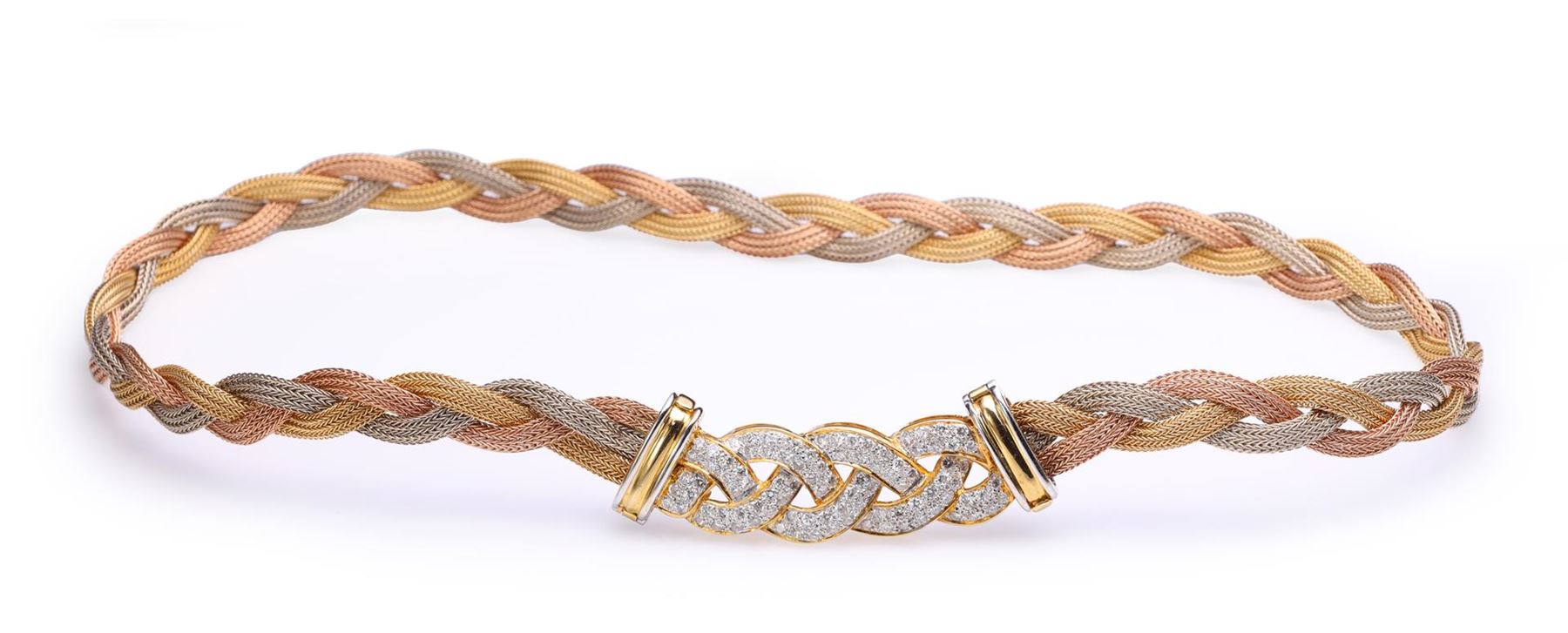Tricolor Gold Necklace Mounted with 18K Yellow Gold and Diamond Centerpiece containing brilliant cut round diamonds weighing approximately 0.38 cts. Total weight of 172 gm. Estimated retail value $14,980