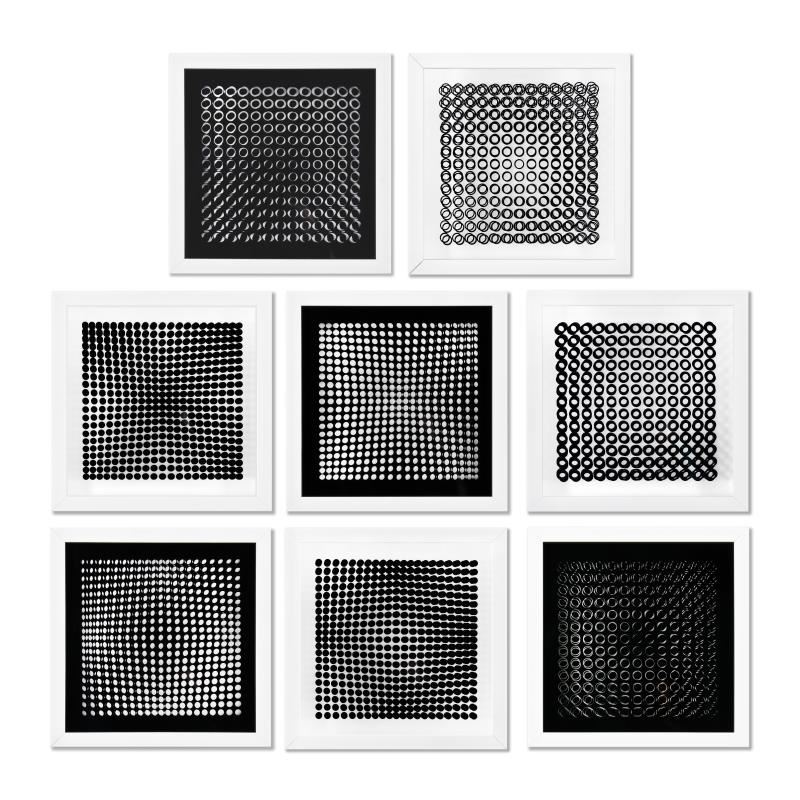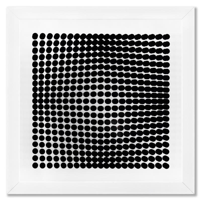 "Trois Dimensions Optique de la série Cinetiques" is a set of 8 dimensional artworks, published in 1973, by Victor Vasarely (1908-1997). These pieces come custom framed, with a letter of authenticity and with a 1976 Vasarely paperback. Measures approx. 11.5" x 11.5" (frame), 9" x 9" (image).