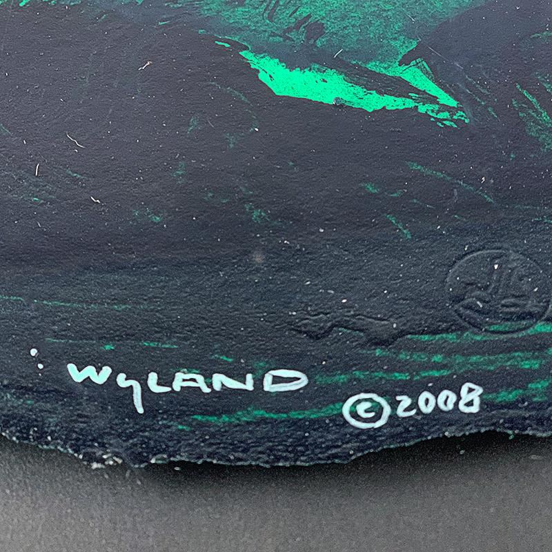 "Turtle Reef Silhouette" is an original painting on Paper by Wyland that is hand signed and comes with a certificate of authenticity. The frame is imperfect with noticeable wear. Measures approximately 32" x 32" (framed), 18" x 18" (image).