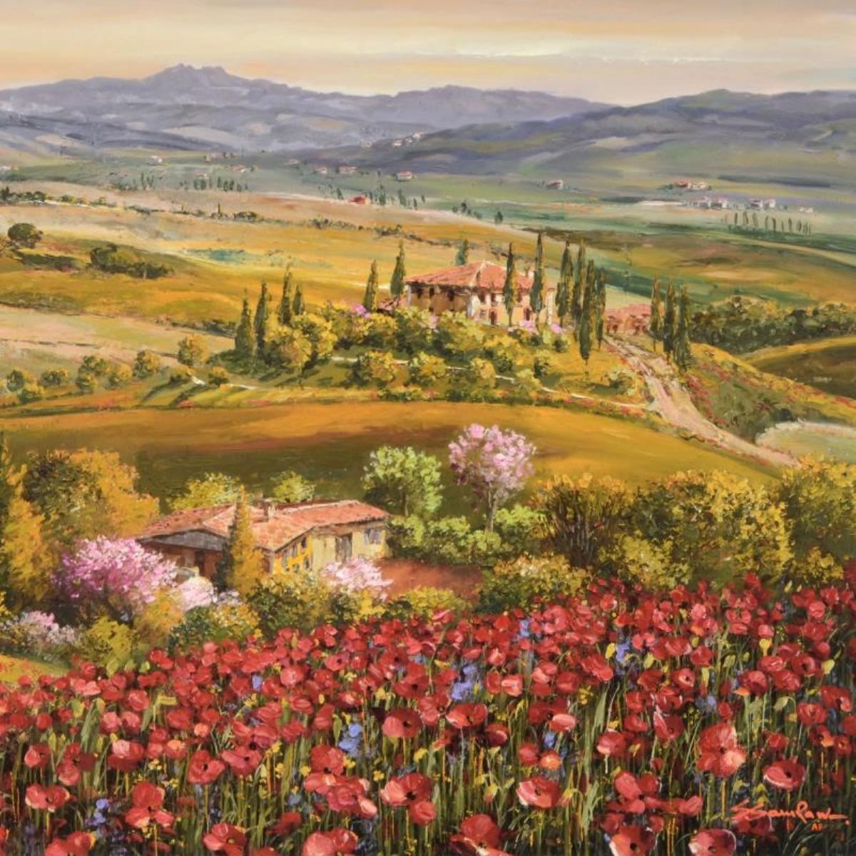 Tuscany Red Poppies by Park, S. Sam. "Tuscany Red Poppies" is a hand embellished limited edition serigraph on stretched canvas by Sam Park, numbered and hand signed by the artist. Includes Letter of Authenticity. Measures approx. 32" x 24" (image). There is minor cracking on the corners and edges that may be concealed when framed.