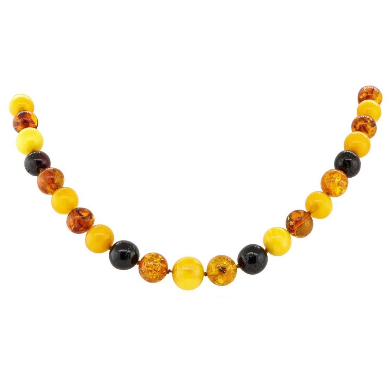 One necklace measuring approximately twenty inches in length featuring: rounded beads of butterscotch, cherry, and honey colored Baltic amber measuring from 14.5mm to 10mm, with a total weight of 36.4 grams.