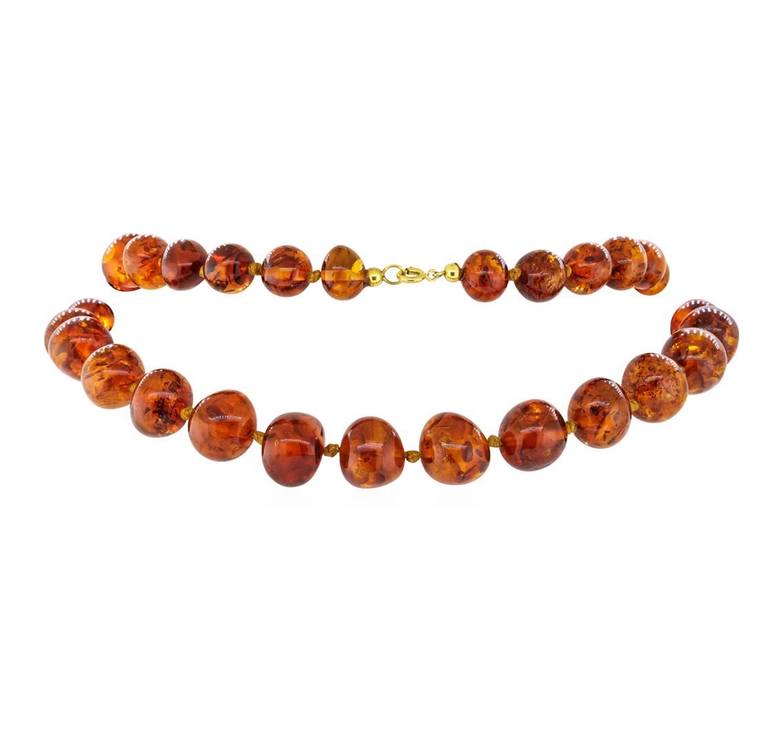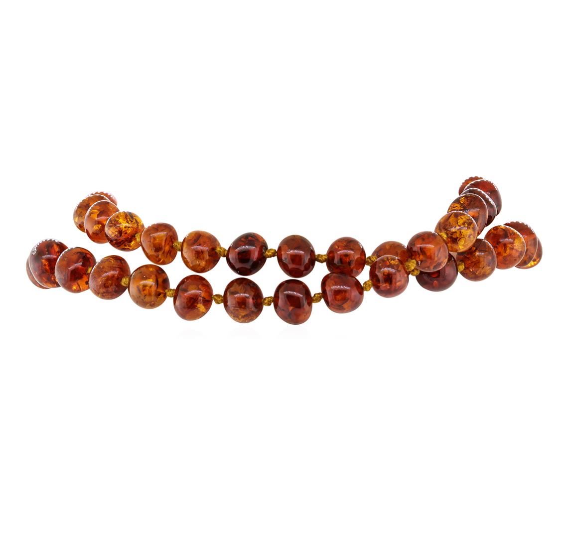 One necklace measuring approximately twenty nine inches in length featuring: rounded beads of honey colored Baltic amber measuring from 15.5mm to 10.5mm, with a total weight of 54.3 grams.
