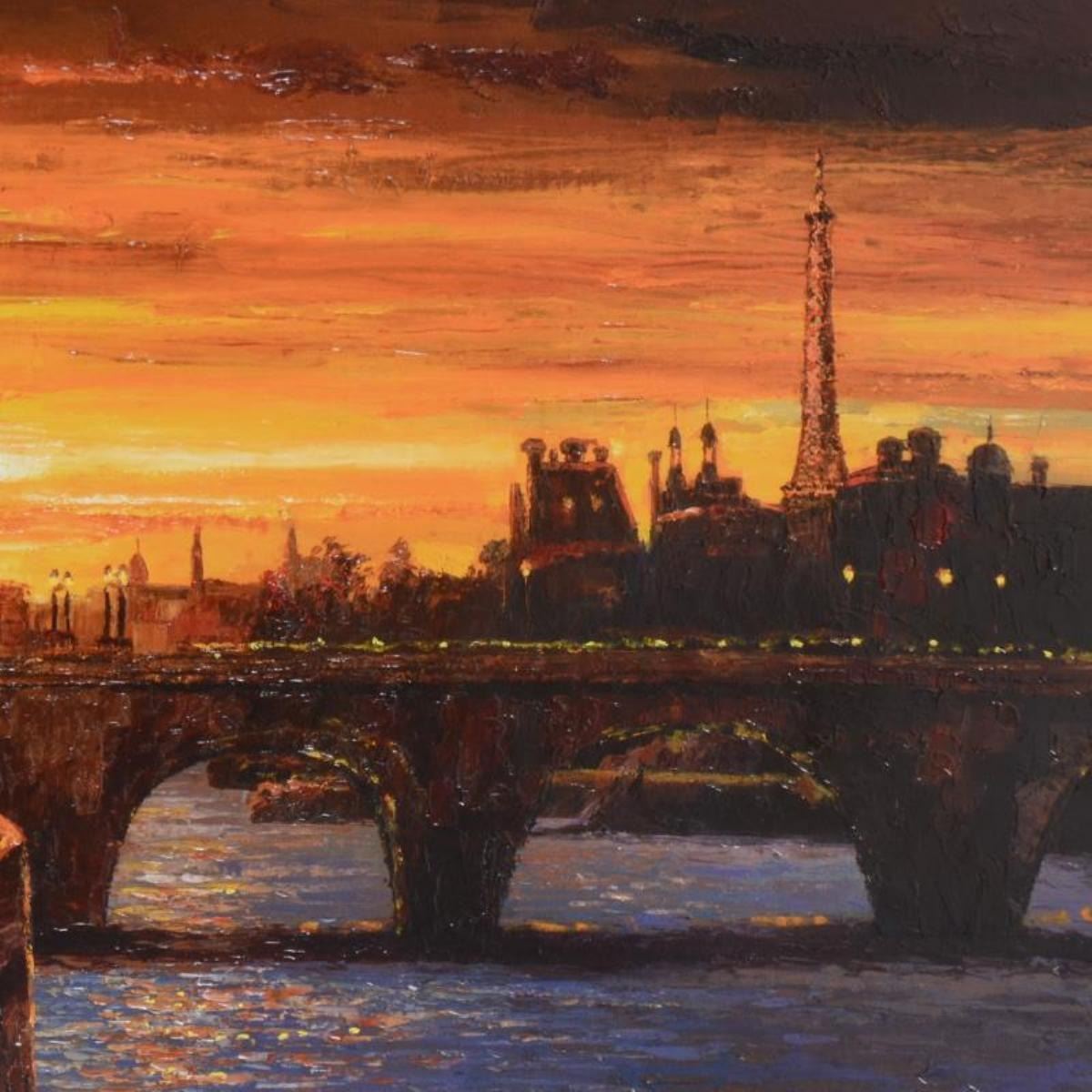 "Twilight on the Seine II" is a limited edition texturized giclee on board by Howard Behrens (1933-2014), numbered and bears the artist's authorized signature. A texturized giclee is a proprietary medium where a mold is made from the original oil painting as a basis for the giclee. Includes Certificate of Authenticity. Measures approx. 36" x 24" (image).