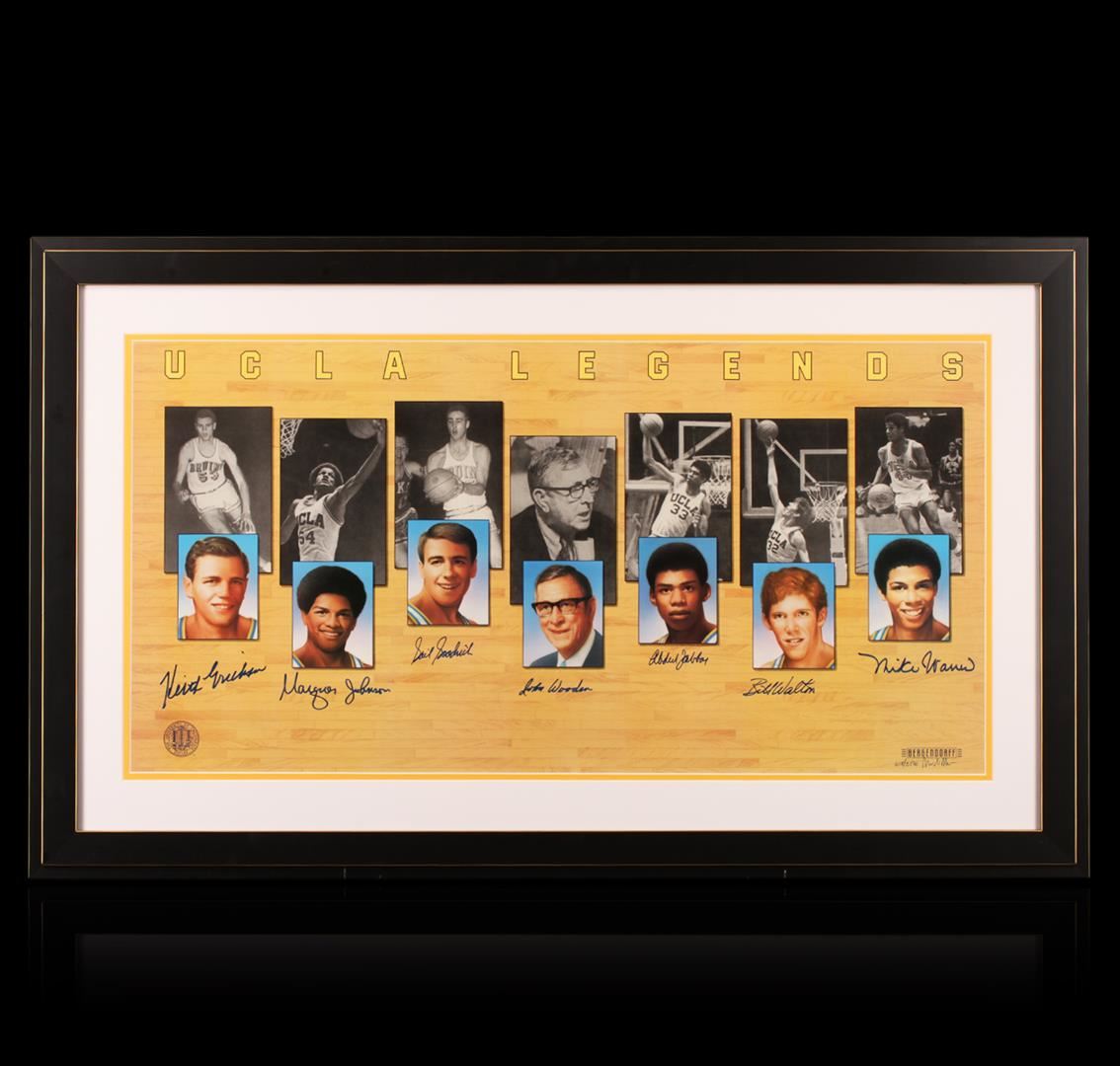 This limited edition lithograph is signed by UCLA Legends: Kareem Abdul-Jabbar, Bill Walton, Gail Goodrich, Marcus Johnson, Keith Ericson, Mike Warren, and coach John Wooden. Comes with Certificate of Authenticity.