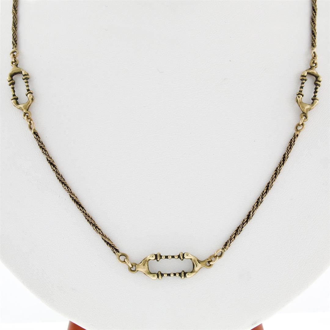 A vintage solid 18k yellow gold chain necklace. 20 inch unique twisted and open bar link chain, 16.08 grams total weight.
