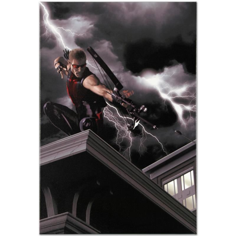 A piece of comic book history, this limited edition, from original art by Kaare Andrews, depicts the heroic Hawkeye. Kaare Andrews is a Canadian comic book writer and artist and filmmaker known for his cover work on Incredible Hulk and many other comic books published by Marvel Comics. He was the first recipient of The Shuster Award for Outstanding Artist in 2005 for his work on Spider-Man: Doctor Octopus. He has also worked on Ultimate X-Men, Gen, The Amazing Spider-Man and The Matrix Comics. "Ultimate Hawkeye #2" is a limited edition numbered giclee on canvas by Kaare Andrews presented by Marvel Comics. This piece comes gallery wrapped. Includes Certificate of Authenticity! Measures approx. 18" x 27" (image).