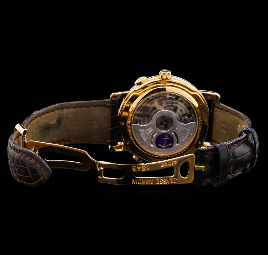 One Ulysses Nardin Perpetual watch featuring: Case: 18KT rose gold, round, 40mm. Dial: Textured silver with bar markers and roman numerals on outer rim, pointed tapered hands. Movement: Automatic. Bracelet: dark brown leather with 18KT rose gold deployment buckle. Crystal: Sapphire. Condition: no scratches on glass, very light wear on case and bracelet but otherwise in near perfect condition.