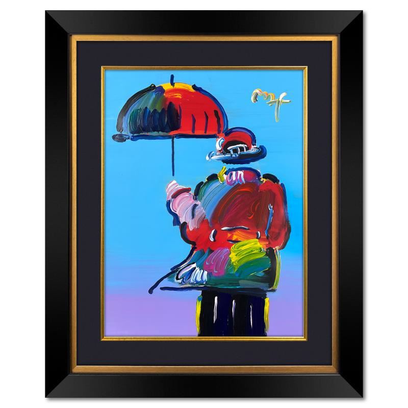 "Umbrella Man" is a one-of-a-kind acrylic mixed media on paper, hand signed by Peter Max. On the reverse side of this piece there is a registration number from Peter Max Studios certifying authenticity. This piece comes custom framed. Measures approx. 44.5" x 36.5" (frame), 31" x 23" (image).