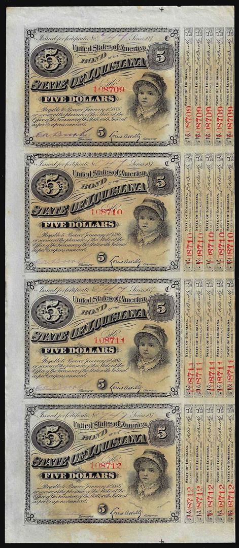 One Uncut Sheet of (4) State of Louisiana Baby Bond Obsolete Notes.