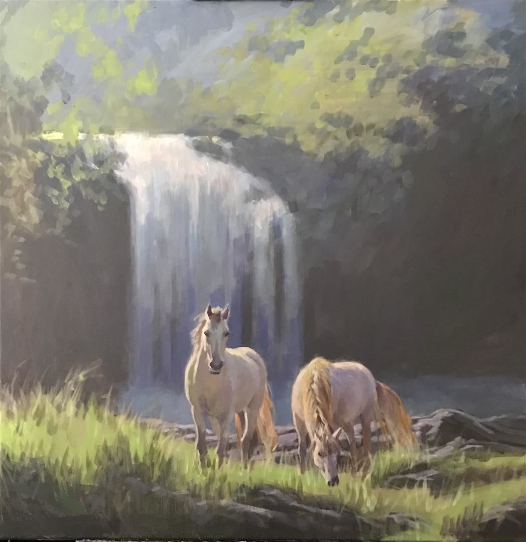 A 30x30" original acrylic on canvas, Under the Waterfall by Richard Ho captures the serenity & the beauty of summer.