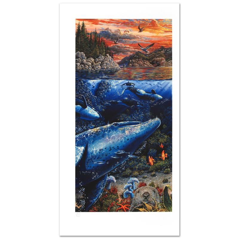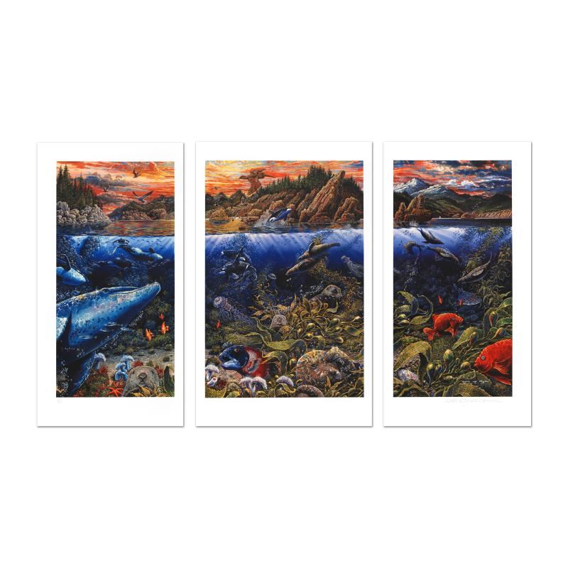"Underwater World" is a limited edition mixed media on paper by Robert Lyn Nelson, numbered and hand signed by the artist! This artwork consists of three separate pieces that are meant to be displayed together as a triptych. Includes Certificate of Authenticity! Measures Approx: 48" x 29" (all three pieces combined), 16" x 24" (center image), 12" x 24" inches (left and right images).