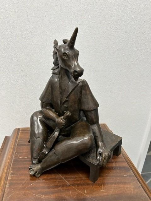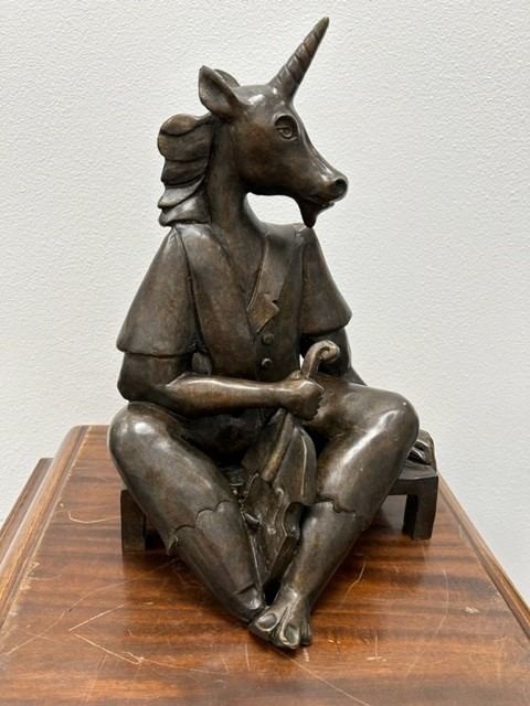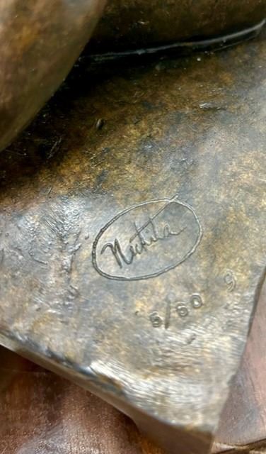 A solid bronze sculpture # 5/60 of one of Alexandra Nechita's imaginary creatures. This handsome sculpture measures 15x10.5x10.5" and weighs app. 15 lbs