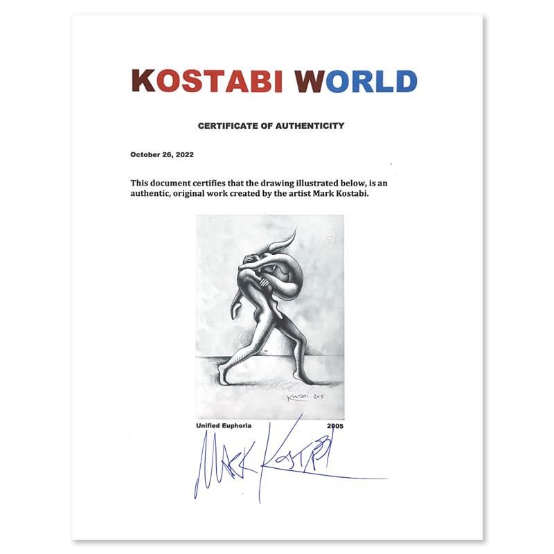 "Unified Euphoria" is an original drawing on paper by Mark Kostabi, dated 2015 and hand signed by the artist. This piece comes custom framed. Includes Certificate of Authenticity. Measures approx. 14.5" x 18" (frame), 9" x 13" (image).