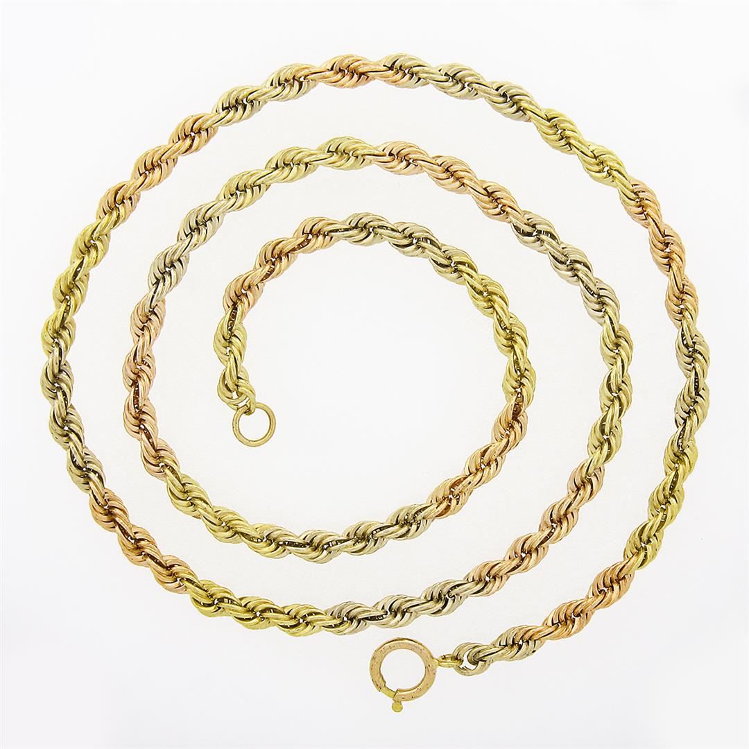 A solid 14k yellow, rose & White Gold rope link chain necklace. It weighs a total of 12.88 grams, measures 3.2mm wide, and measures 15.5 inches in length.