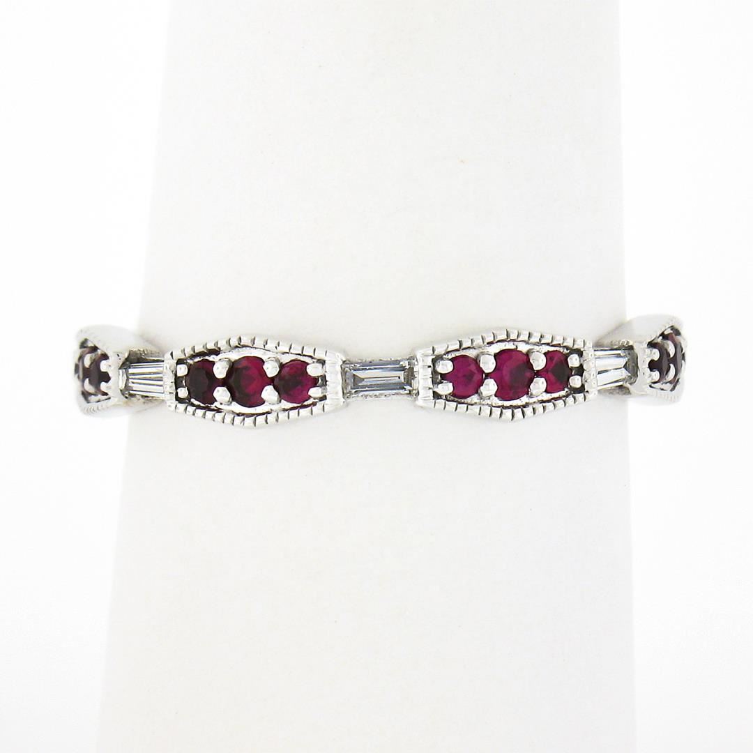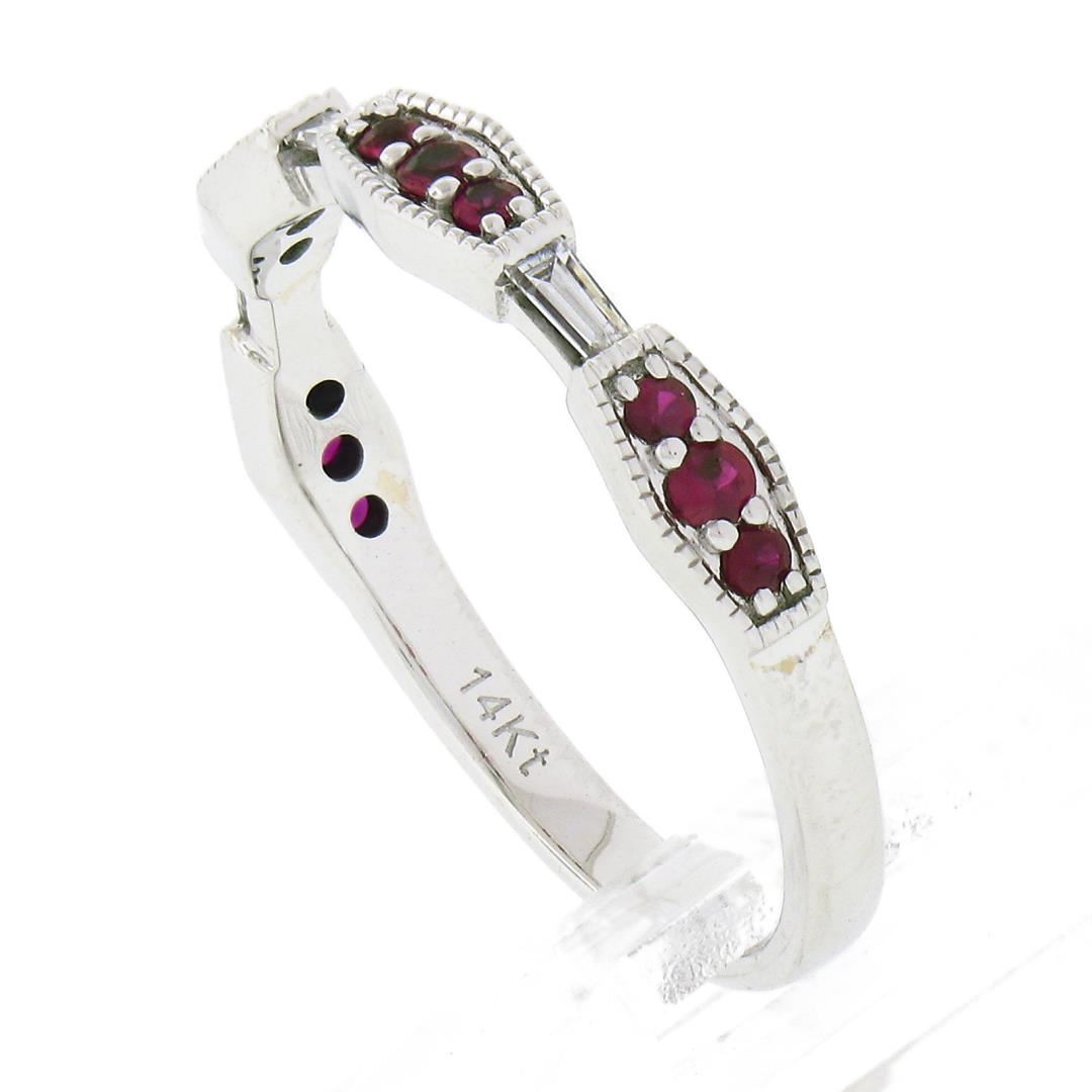 A solid 14k white gold band ring, with 12 round brilliant cut natural rubies (0.24ctw ), and 3 baguette cut natural diamonds (G/H - VS1/VS2 ; 0.10ctw). The ring is size 7.0, weighs a total of 2.24 grams, and measures 3.2mm wide.