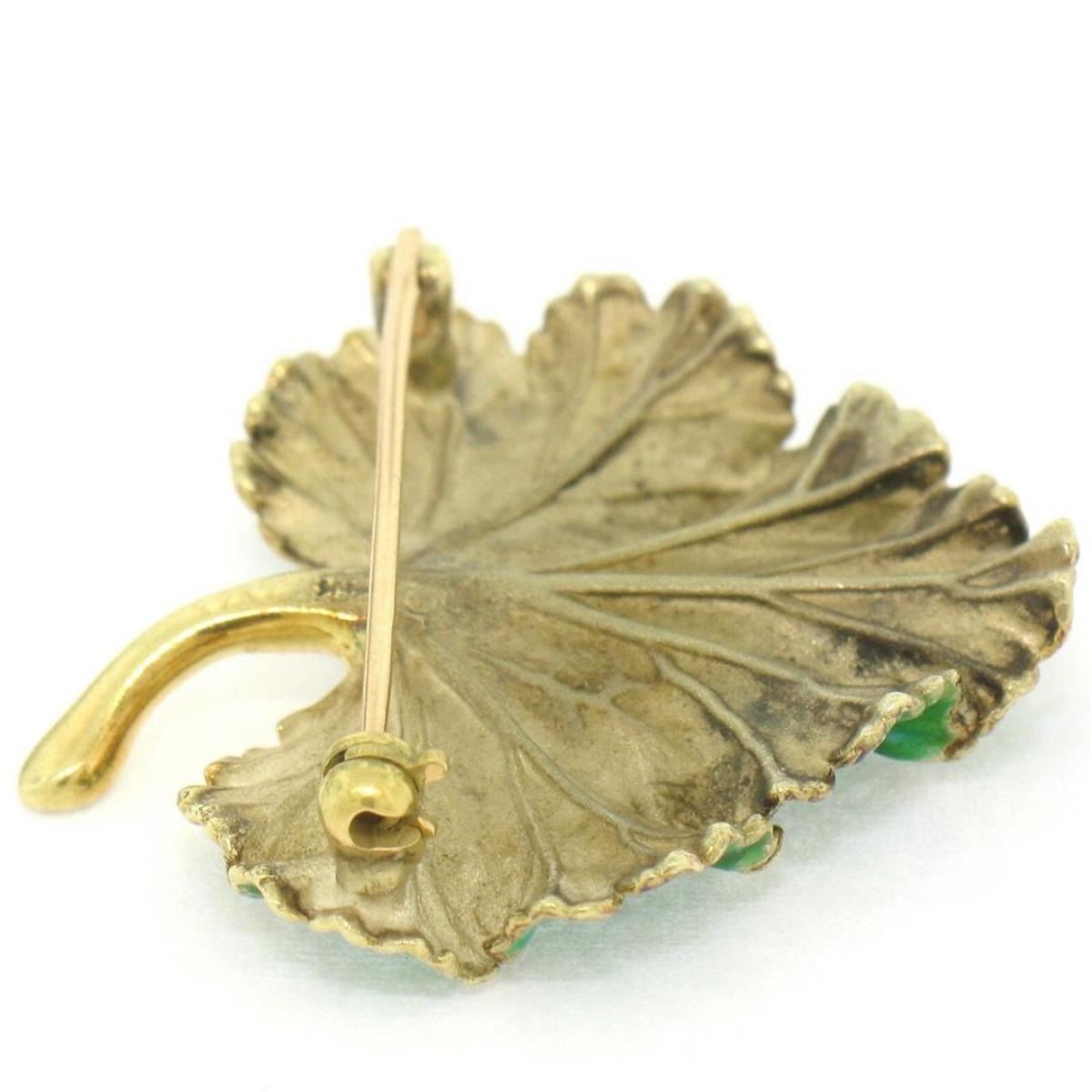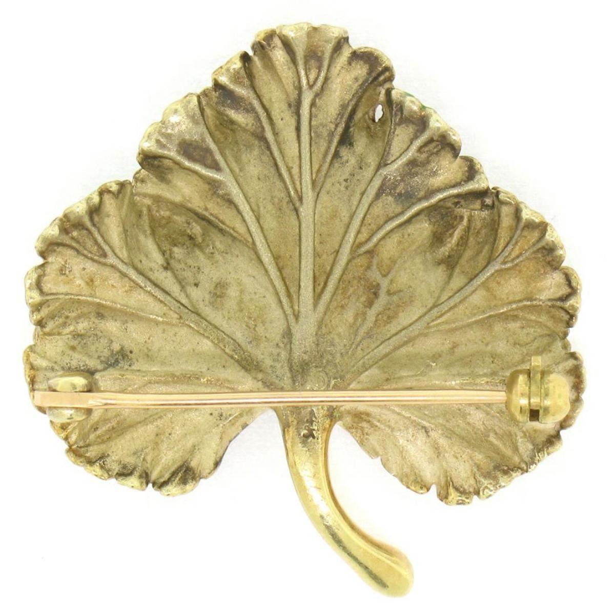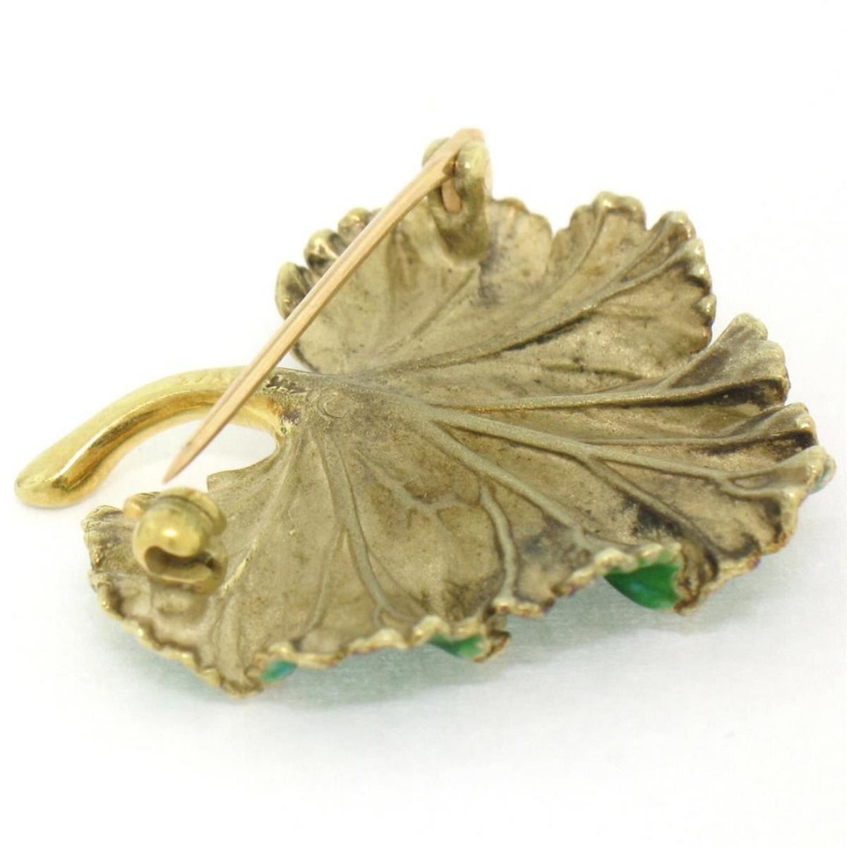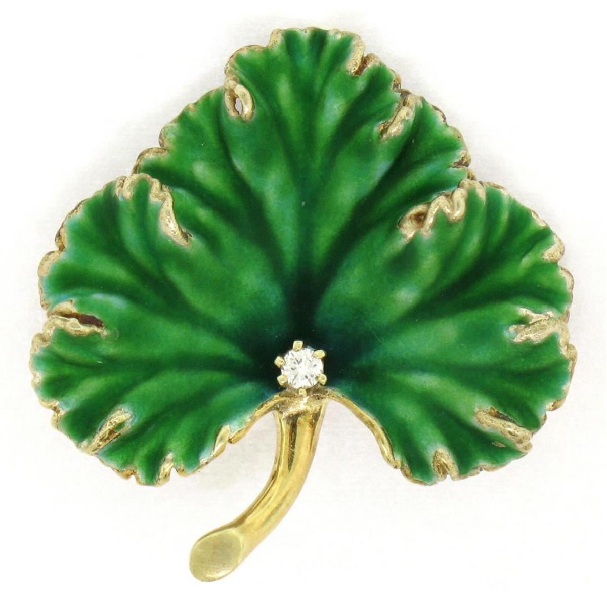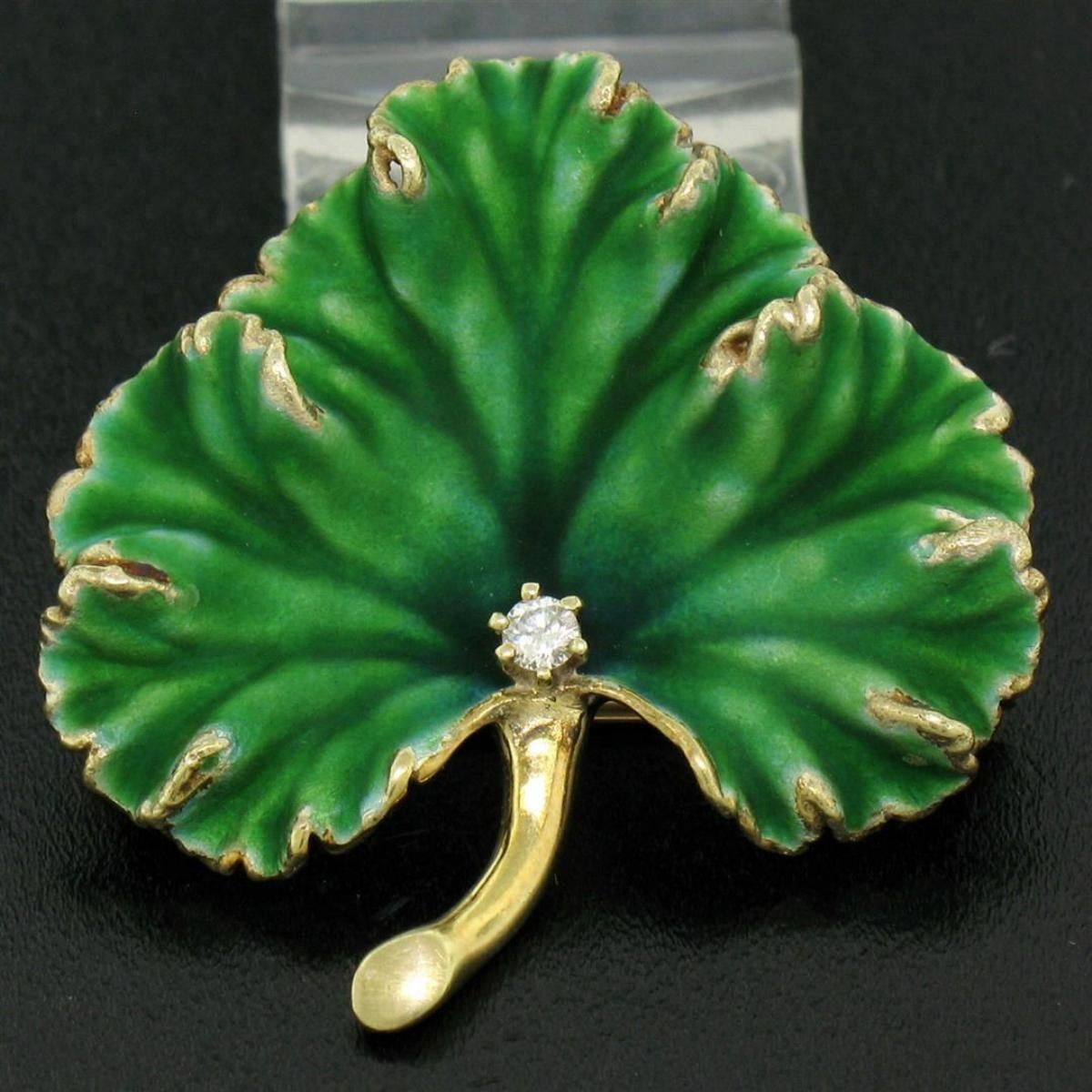 One Unique Omega Vintage 14K Yellow Gold Green Enamel & Diamond Detailed Leaf Brooch. Item Details: Material: 14K Solid Yellow Gold, Total Weight: 6.39 Grams, Stone(s): (1) Natural Genuine Diamond - Prong Set - Round Brilliant Cut - F Color - VS1 Clarity - 0.05ct (approx.), Total Carat Weight: 0.05 (approx.), Overall Height: 30.48mm, Overall Width: 29.50mm, Overall Thickness: 3.85mm (at its thickest, not including the pin), Condition: Vintage designer piece. Excellent condition!