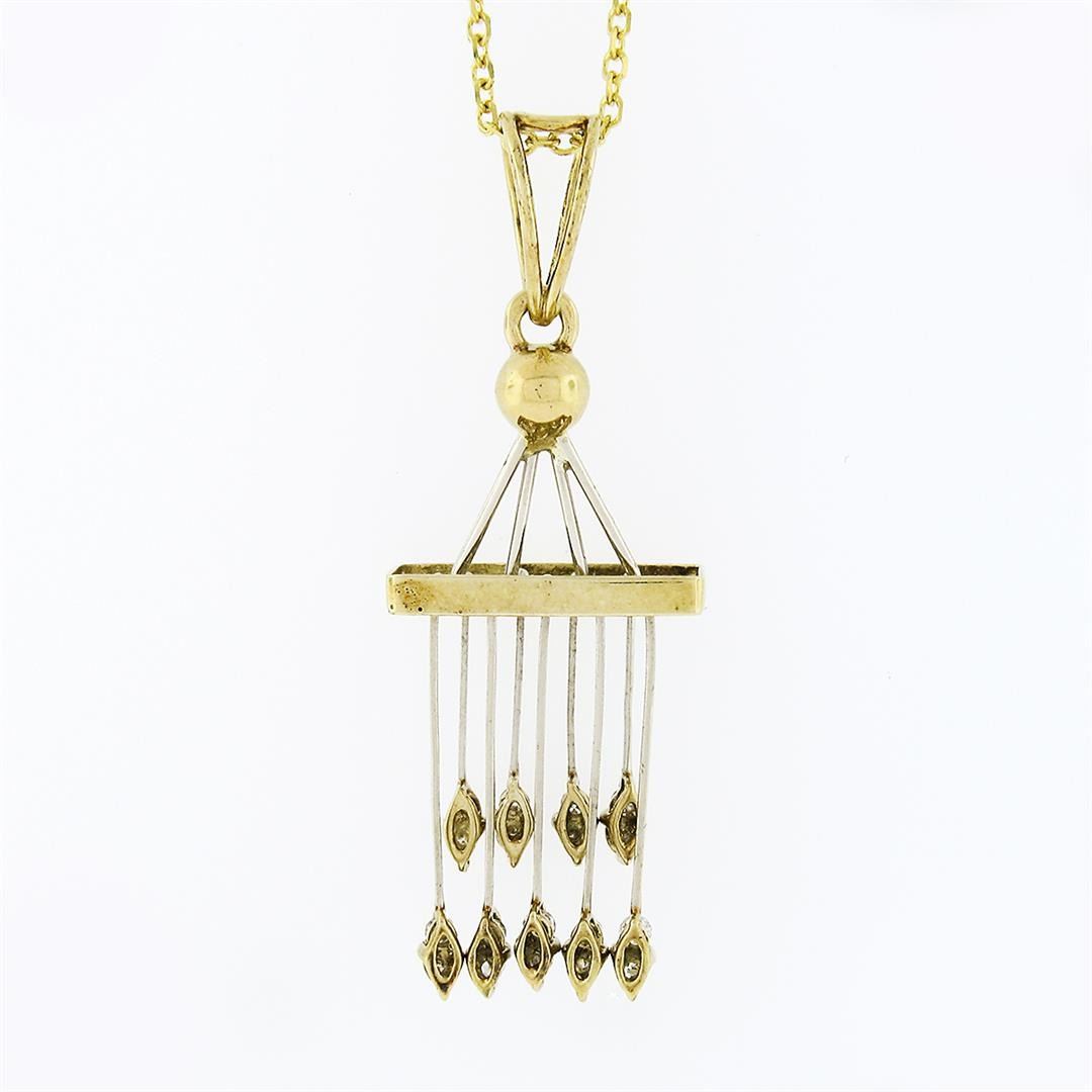 A vintage solid 14k yellow & white gold tassel dangle pendant necklace, with 18 round brilliant cut natural diamonds (H/I - VS2/SI1 ; 0.36ctw). 18 inch cable link chain, 7.06 grams total weight, pendant measures 48.45x17.35mm.