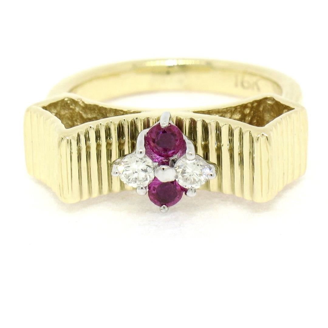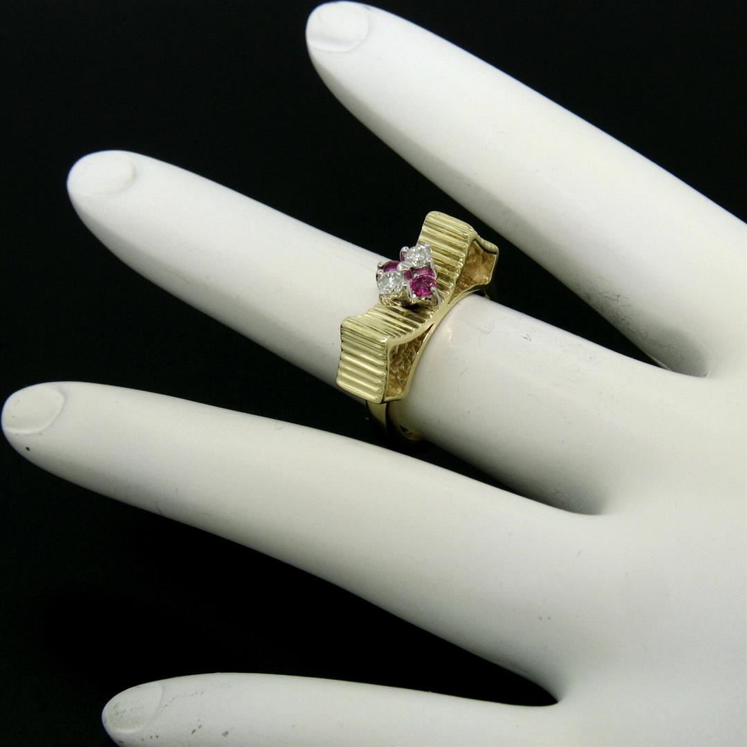 A vintage solid 18k yellow gold bow cluster ring, with 2 round cut natural rubies (0.15ctw ), and 2 round brilliant cut natural diamonds (F - VS2; 0.10ctw). The ring is size 4.5, weighs a total of 6.10 grams, and measures 5.40mm wide.