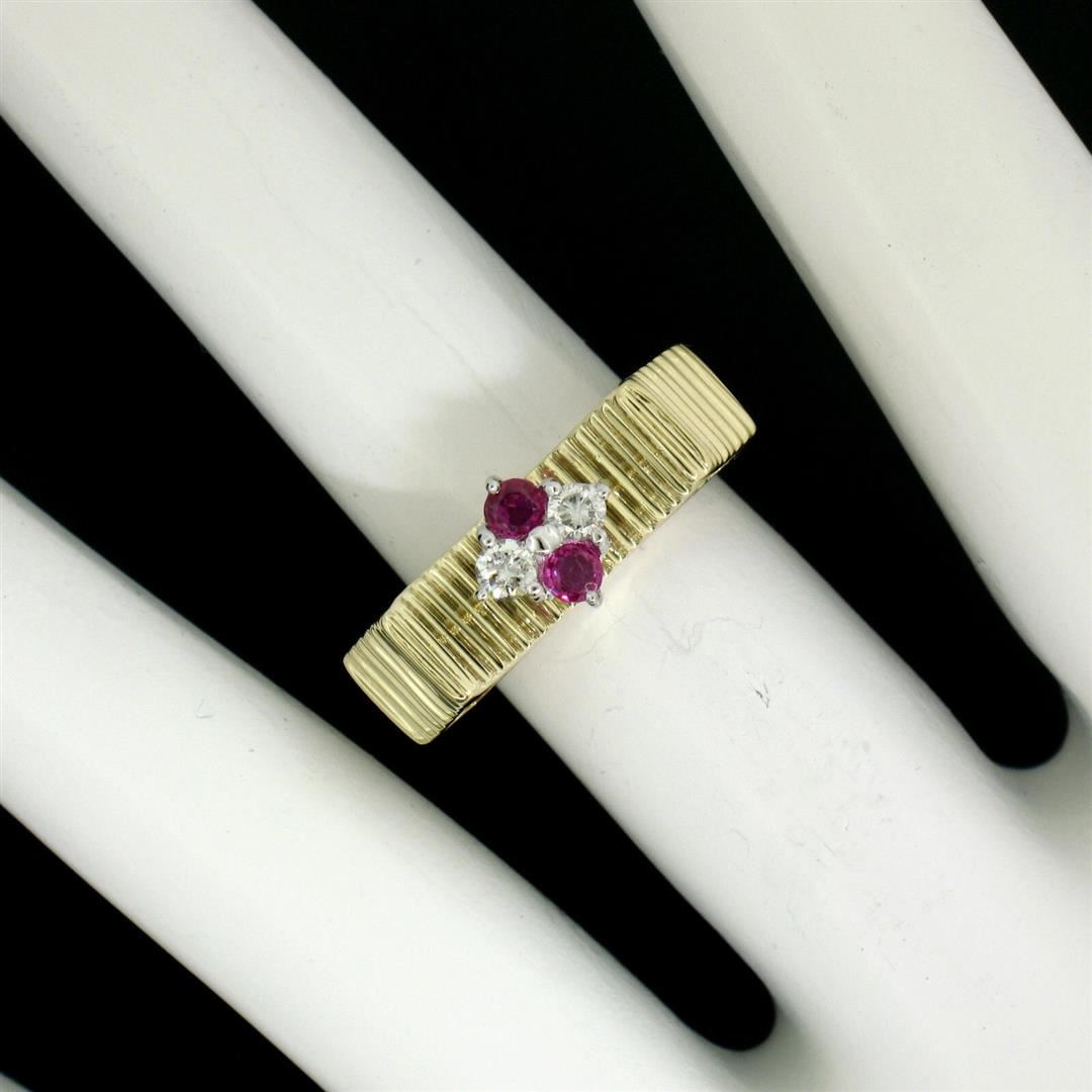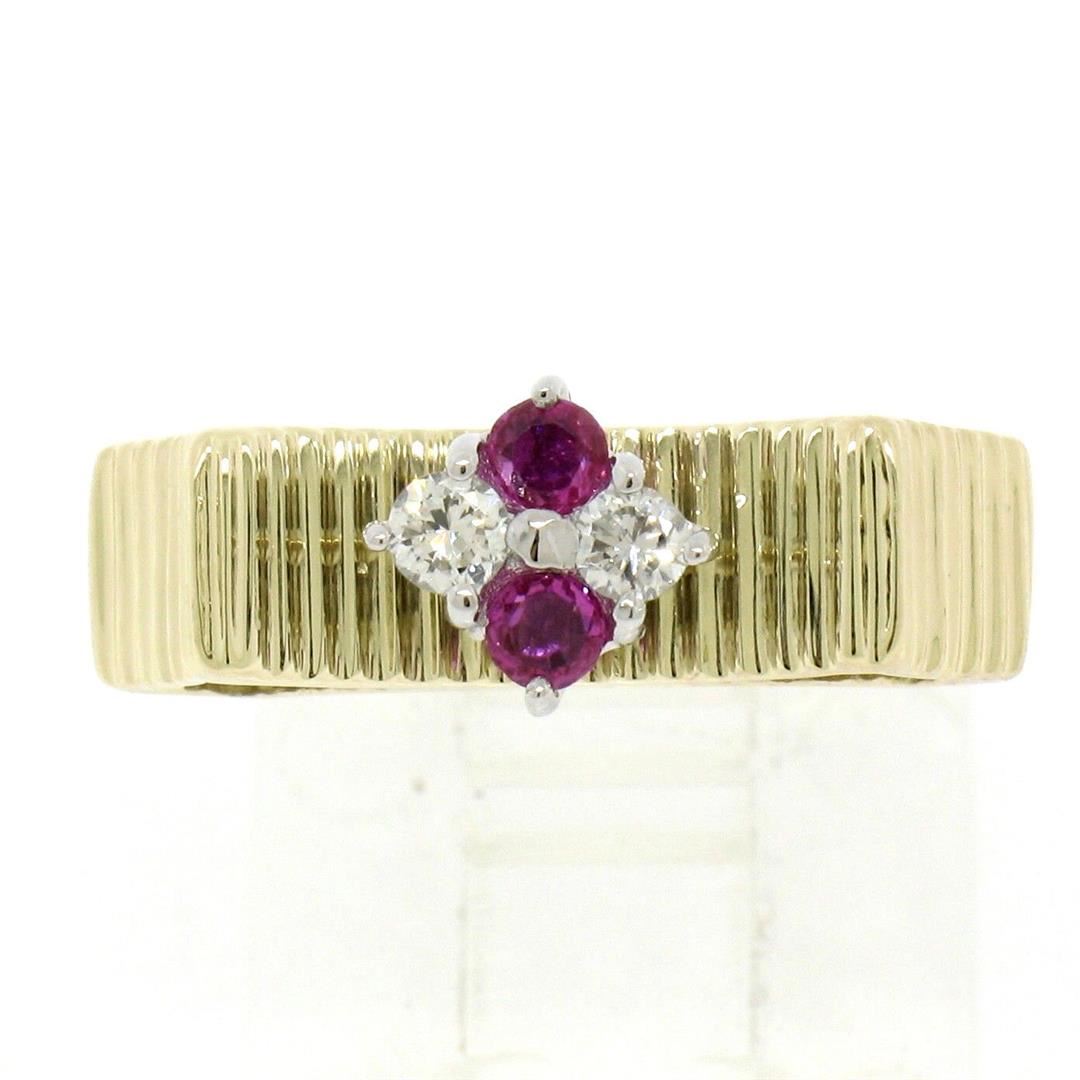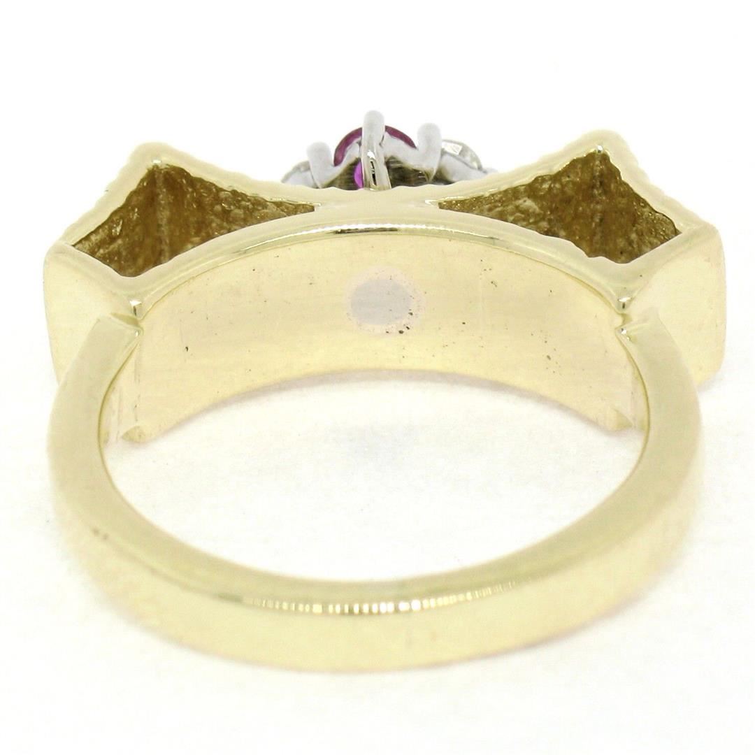 Unique Vintage 18K Yellow Gold.25 ctw Round Ruby Diamond Textured Cluster Ring