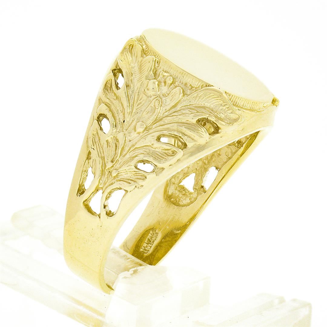 A solid 14k yellow gold signet ring. The ring is size 10, weighs a total of 7.78 grams, and measures 15.40mm wide.