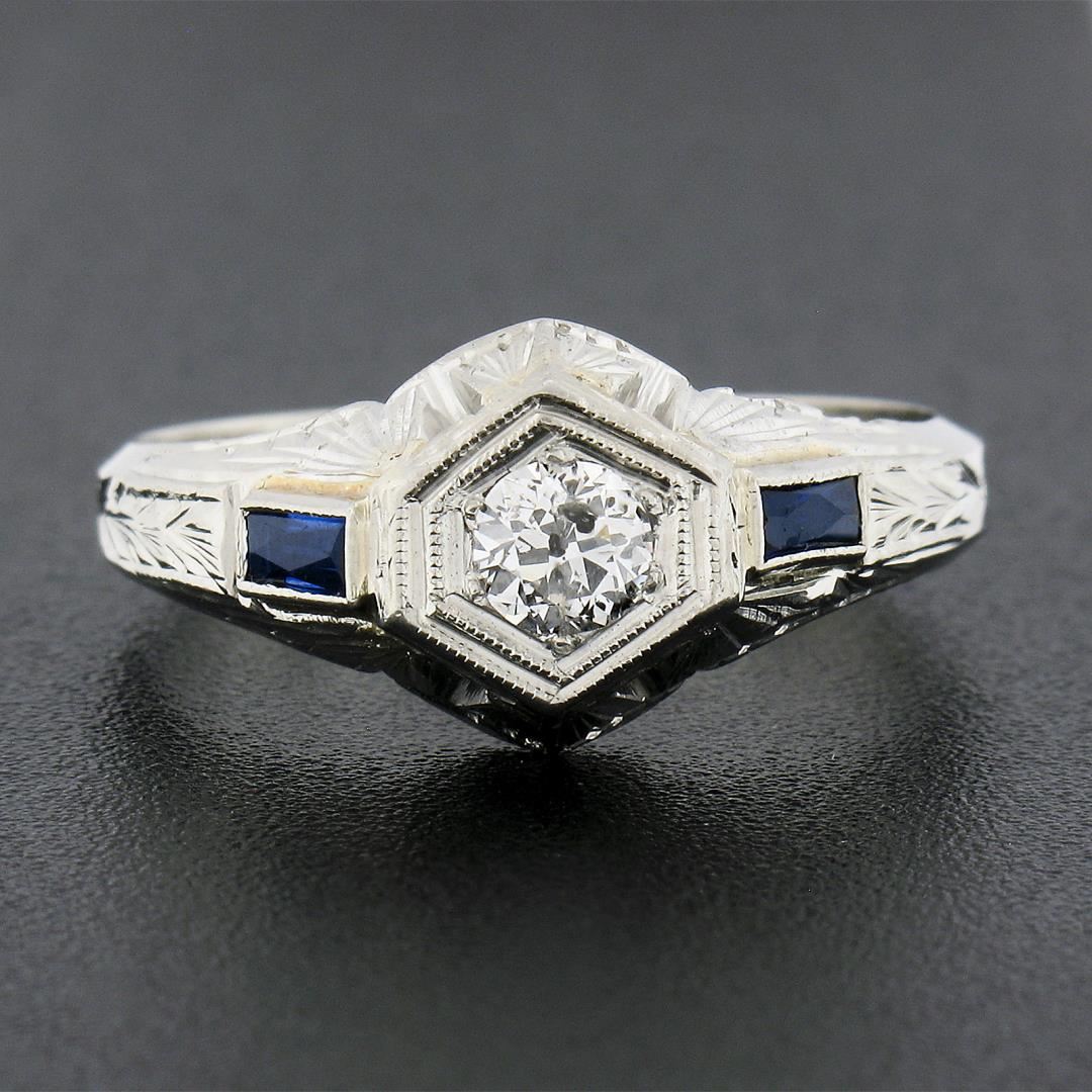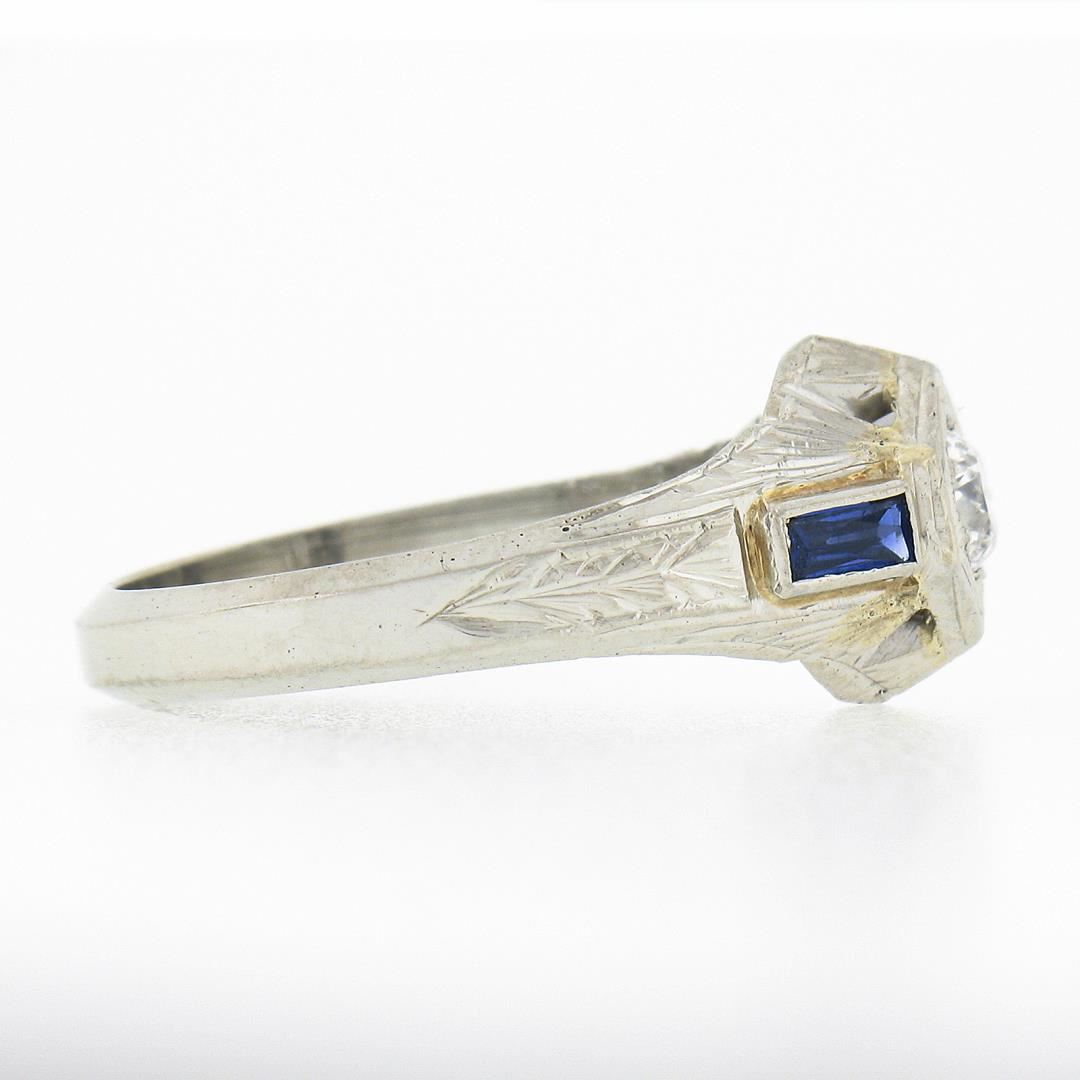 An antique solid 18k white gold ring, with 1 old European cut natural diamond (H - I1 ; 0.28ct), and 2 French baguette cut natural sapphires (0.24ctw). The ring is size 9.0, weighs a total of 5.49 grams, and measures 10.15mm wide.