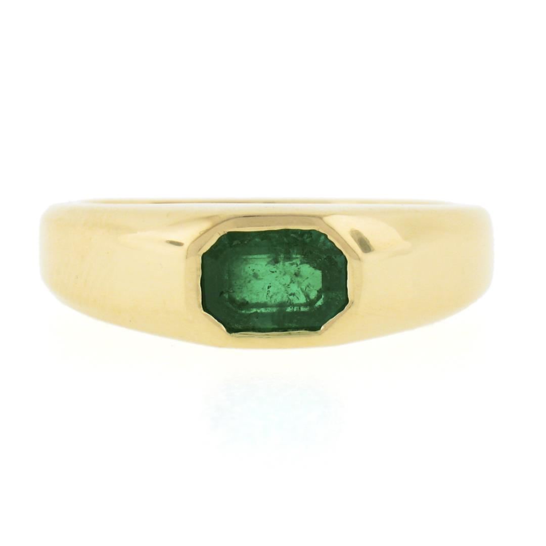 A new solid 14k yellow gold ring, with 1 sideways emerald cut natural emerald ( 0.66ct). The ring is size 6.5, weighs a total of 4.0 grams, and measures 6.3mm wide.
