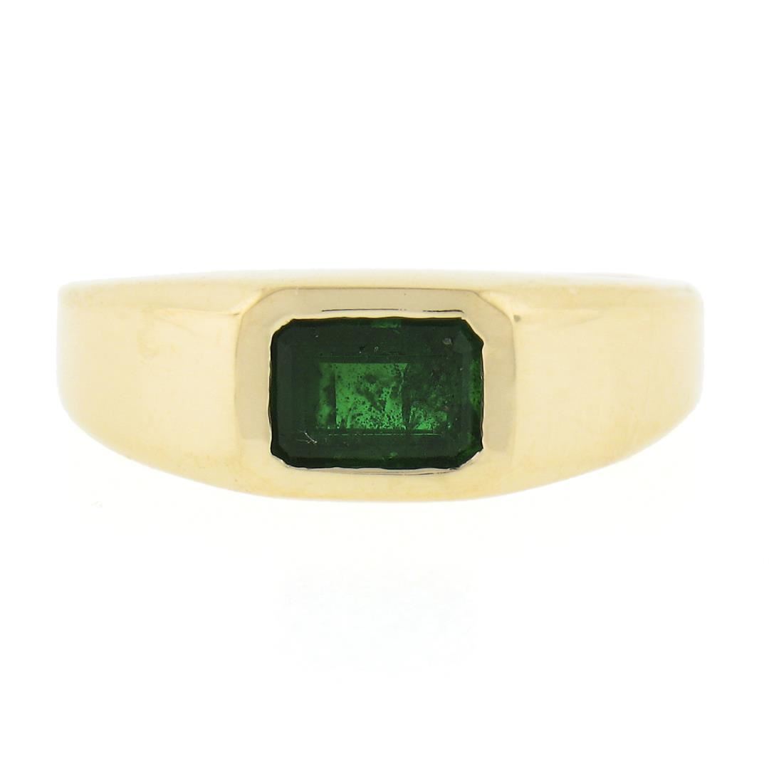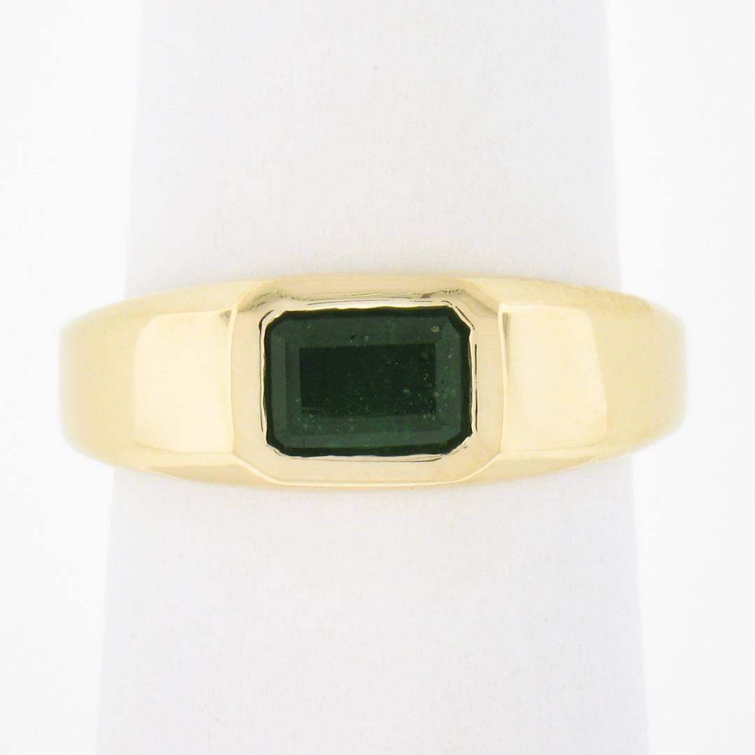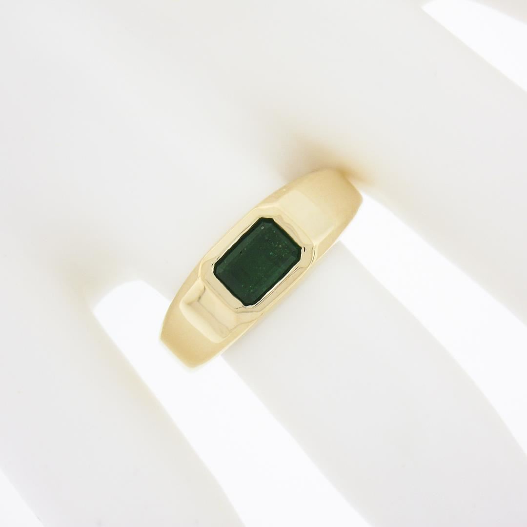 A new solid 14k yellow gold ring, with 1 elongated emerald cut natural emerald (0.64ct). The ring is size 6.5, weighs a total of 4.39 grams, and measures 7.1mm wide.