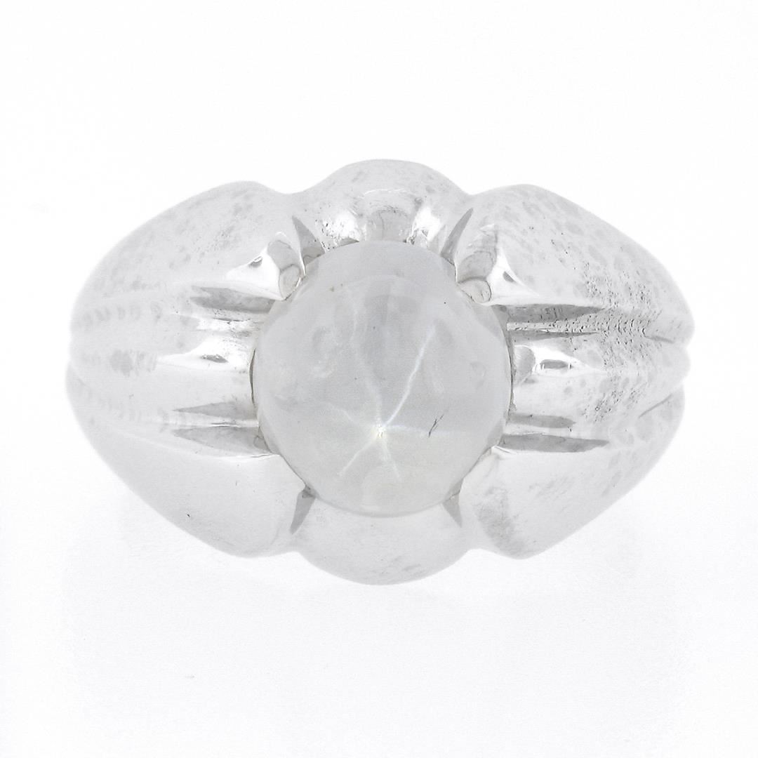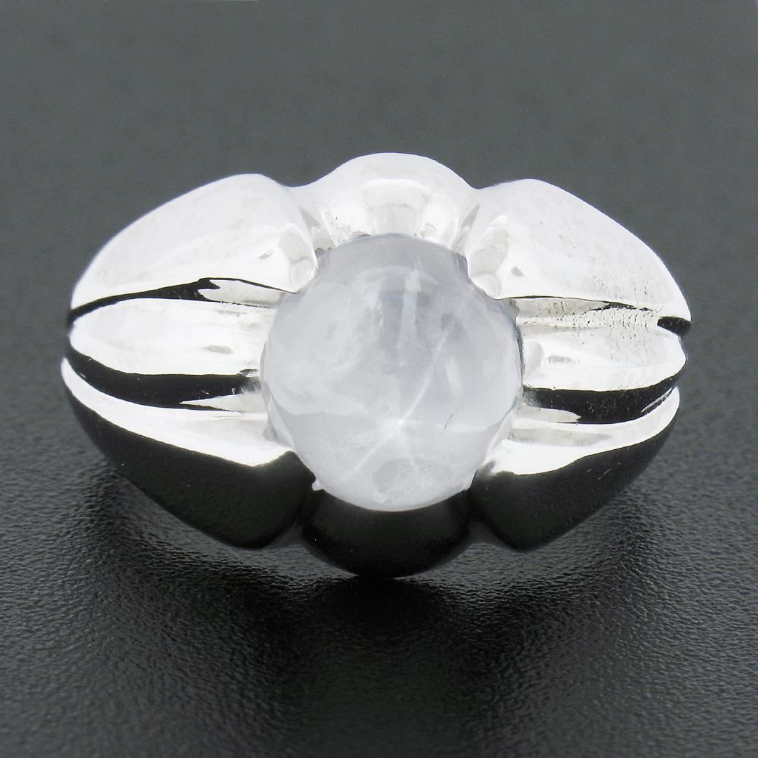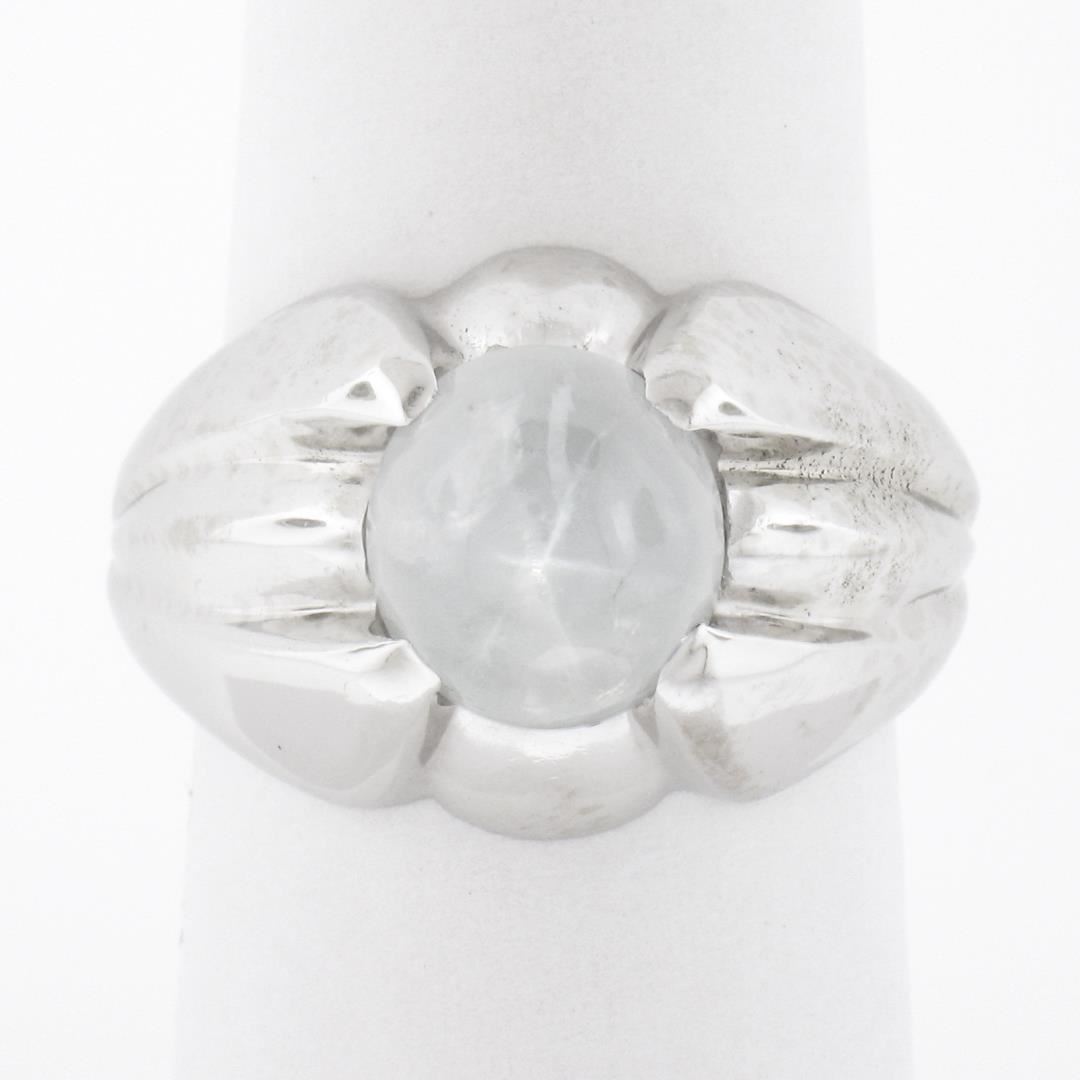 A vintage sp;iod 14k white gold solitaire ring, with 1 oval cabochon cut natural star sapphire (9.08x8.43x6.4mm - 5.40ct). The ring is size 7.0, weighs a total of 8.80 grams, and measures 14.25mm wide.