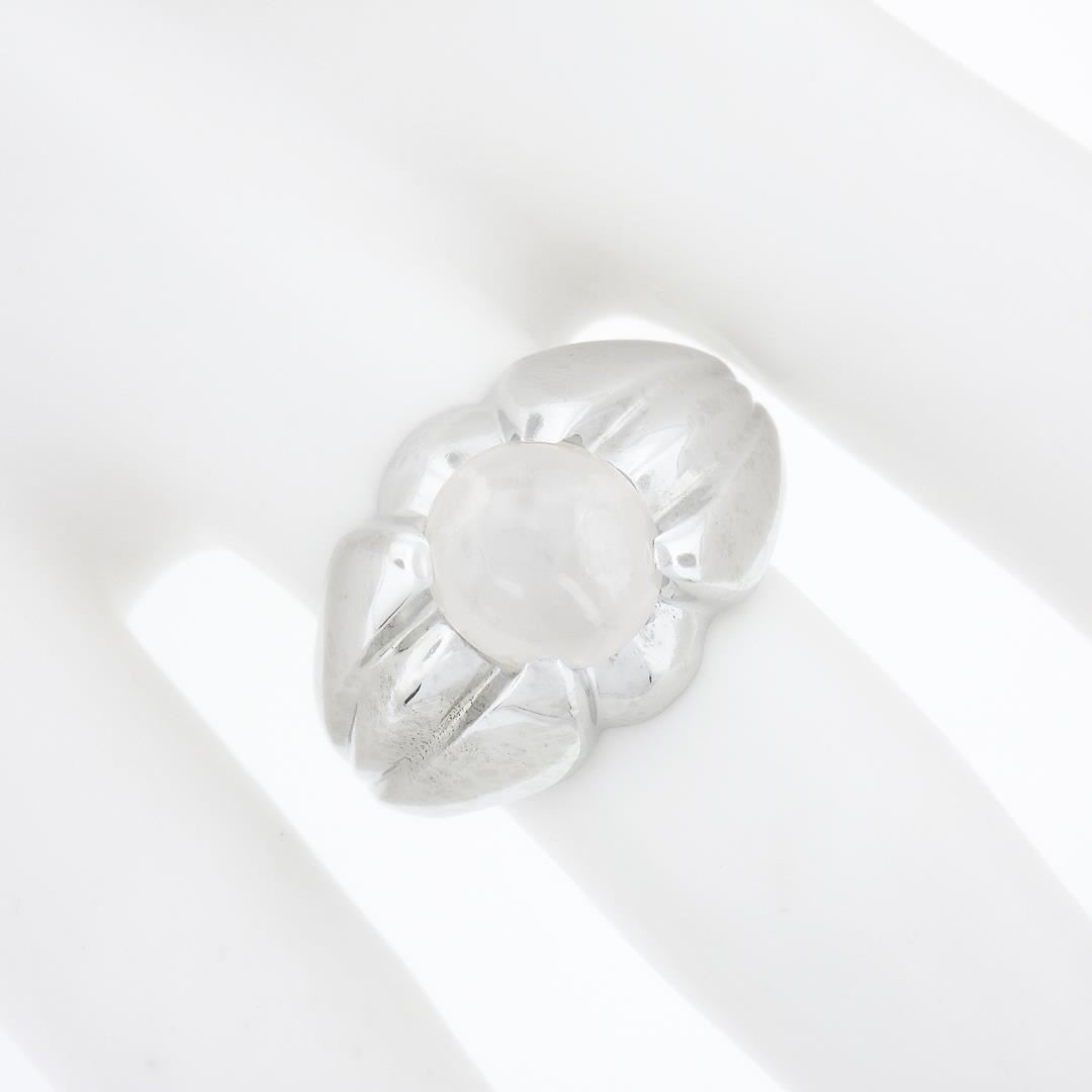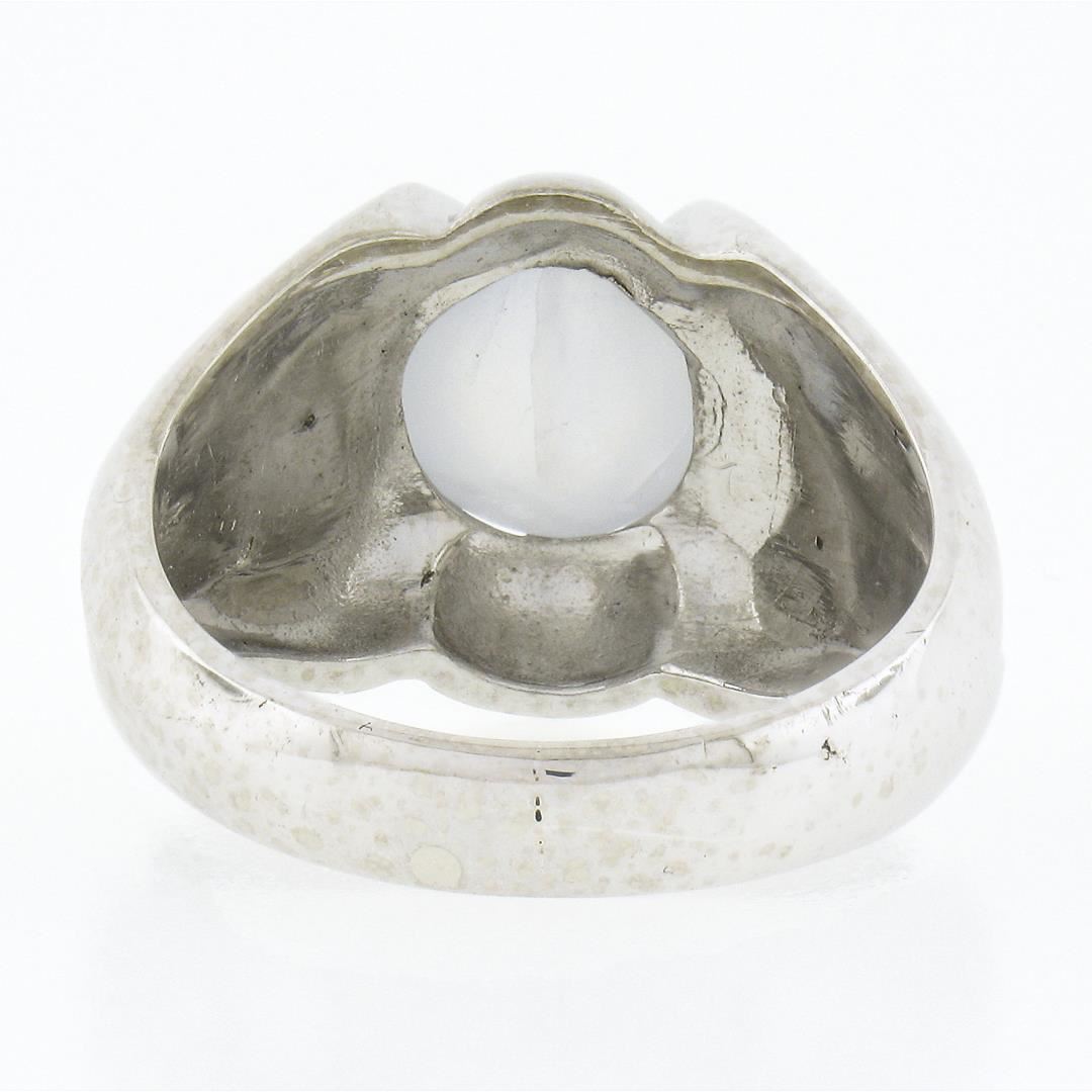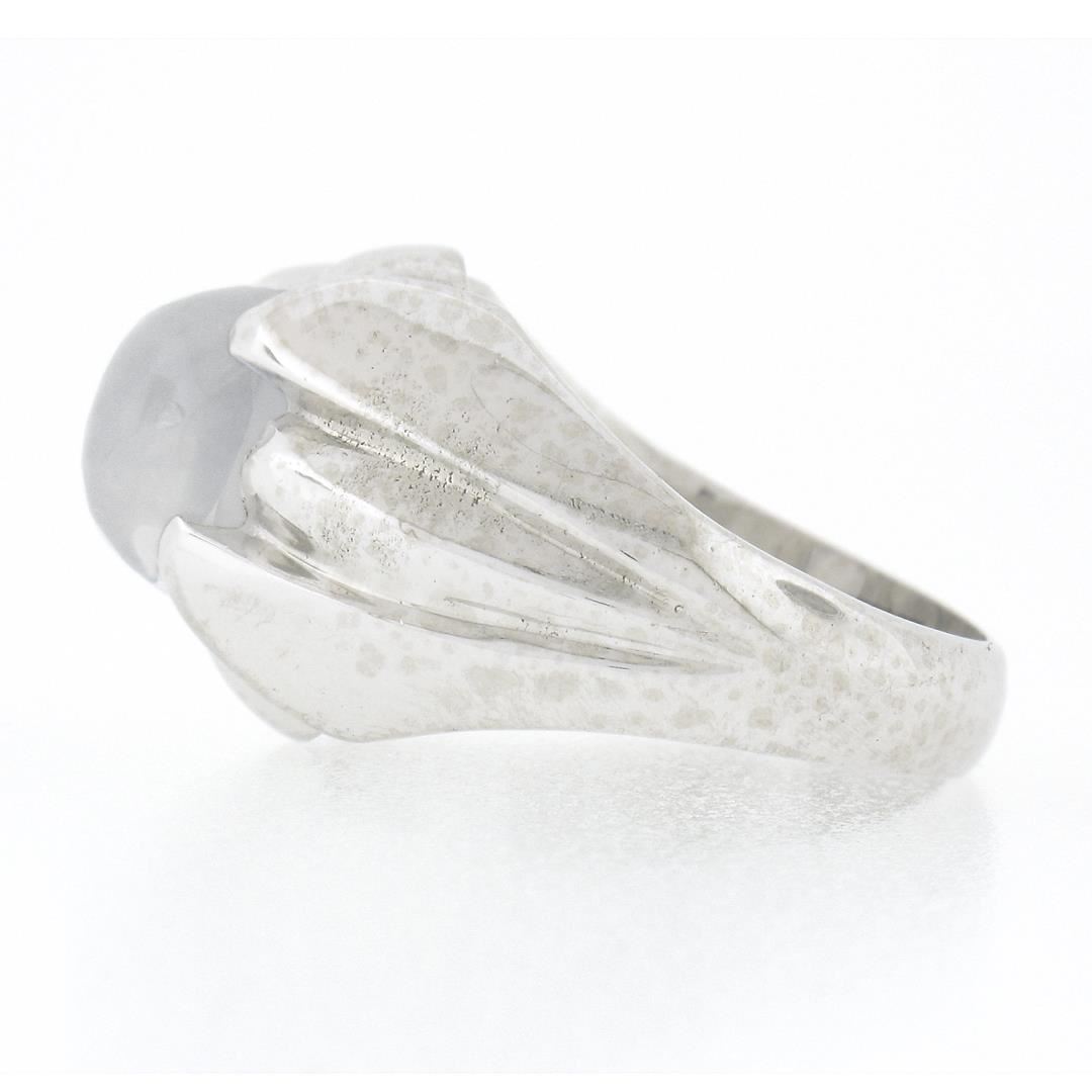 A vintage sp;iod 14k white gold solitaire ring, with 1 oval cabochon cut natural star sapphire (9.08x8.43x6.4mm - 5.40ct). The ring is size 7.0, weighs a total of 8.80 grams, and measures 14.25mm wide.