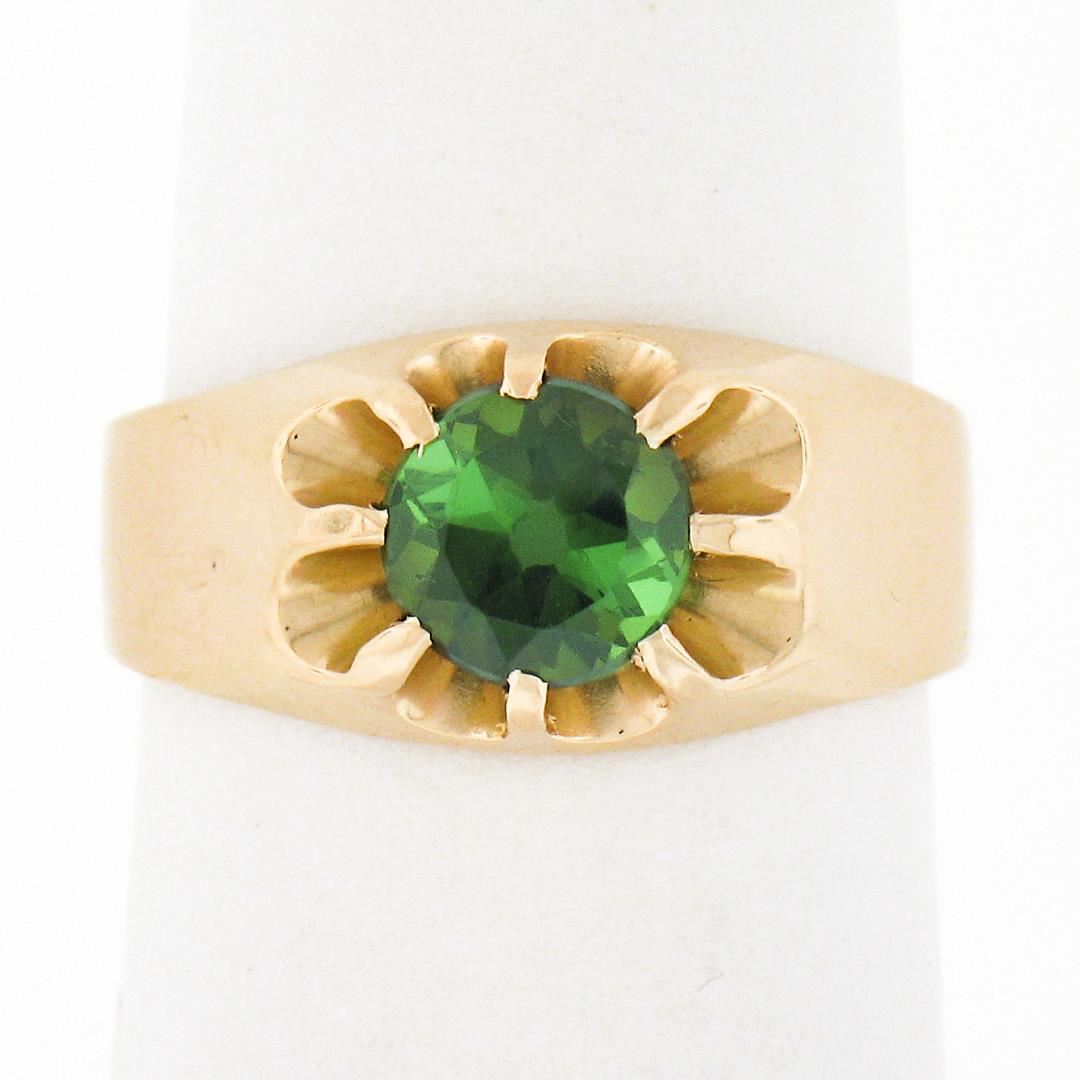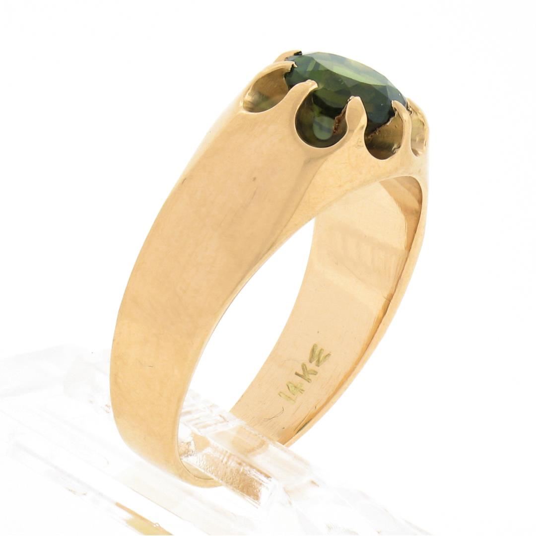 A vintage solid 14k yellow gold solitaire ring, with 1 round brilliant cut natural tourmaline (6.15mm / 0.85ct). The ring is size 5.5, weighs a total of 4.46 grams, and measures 8.7mm wide.