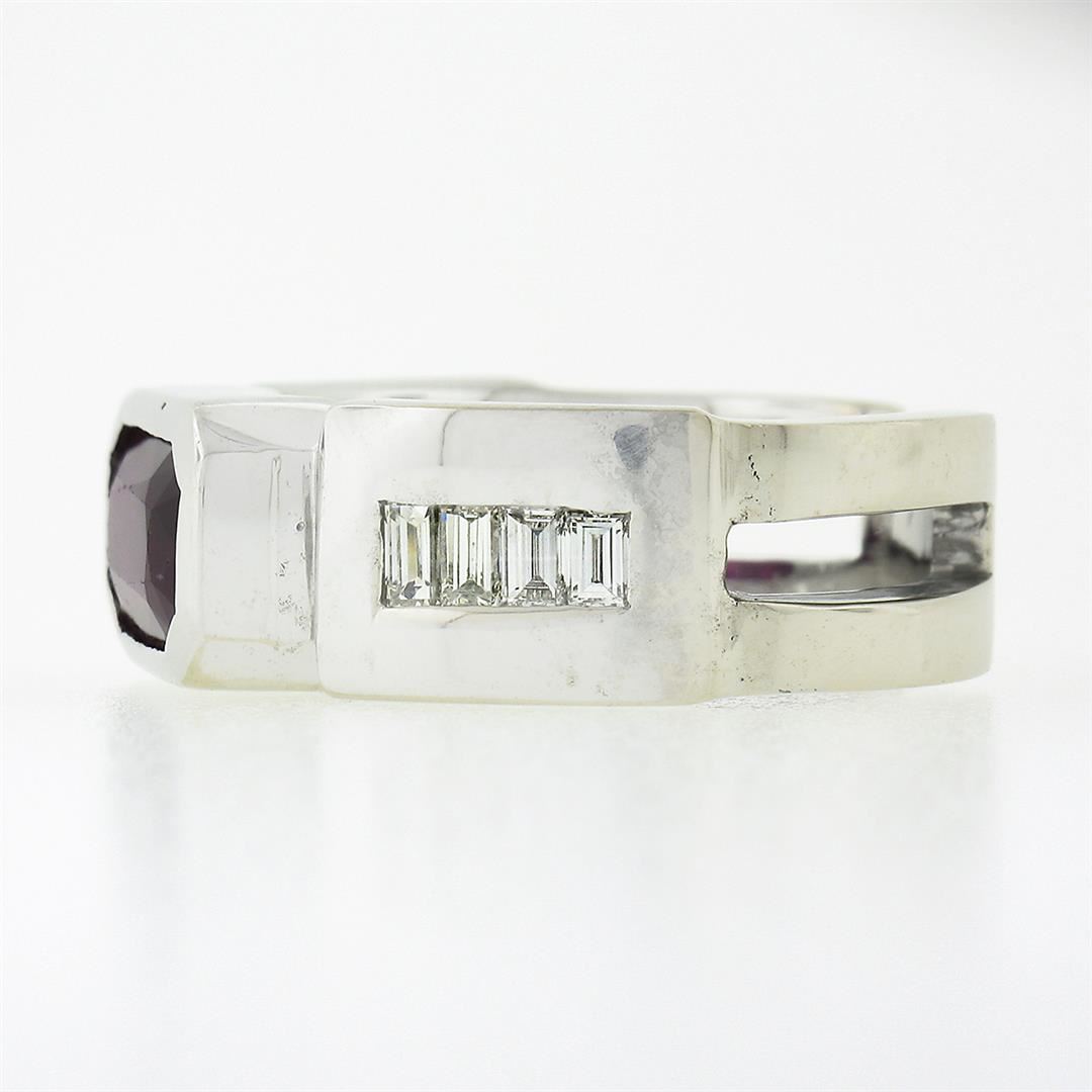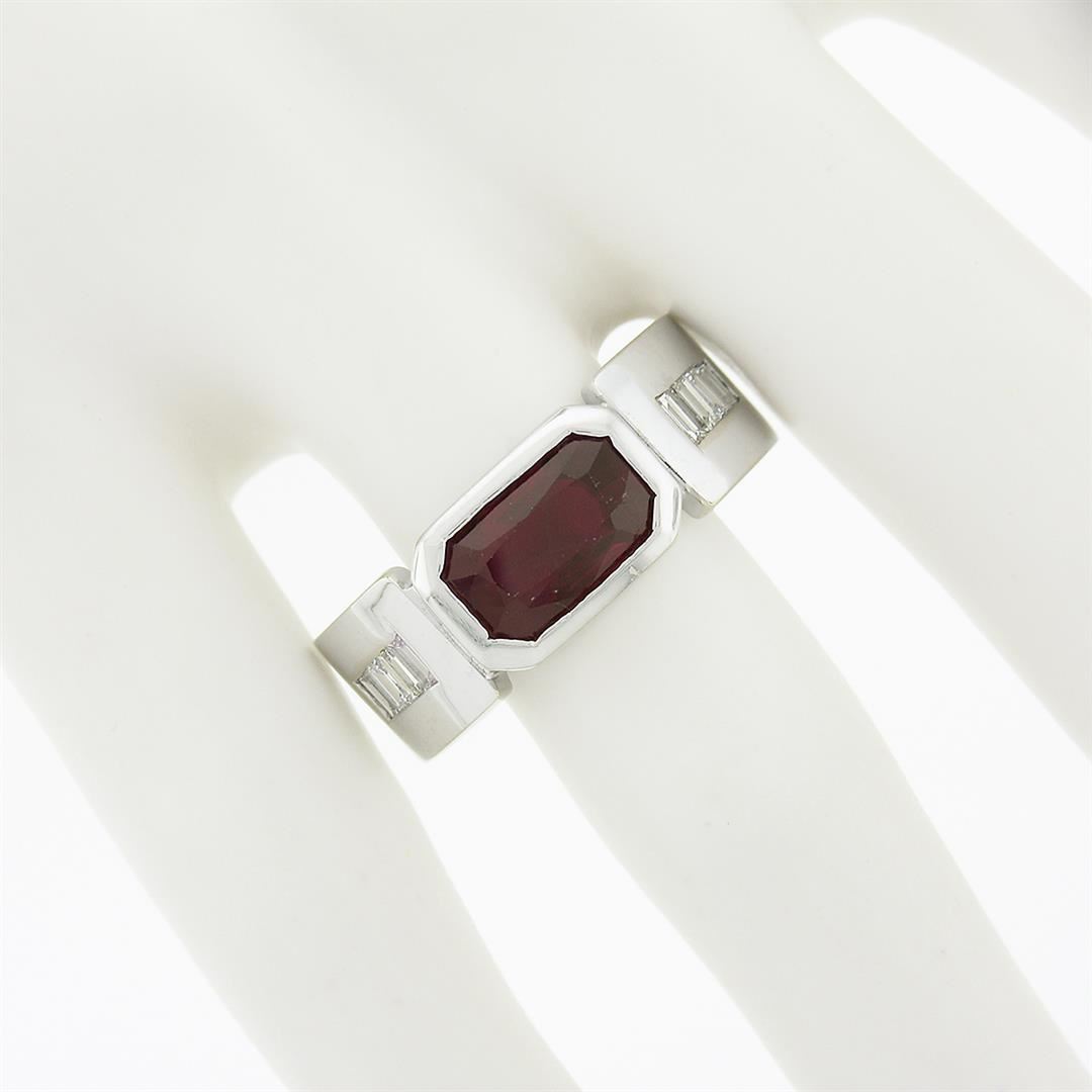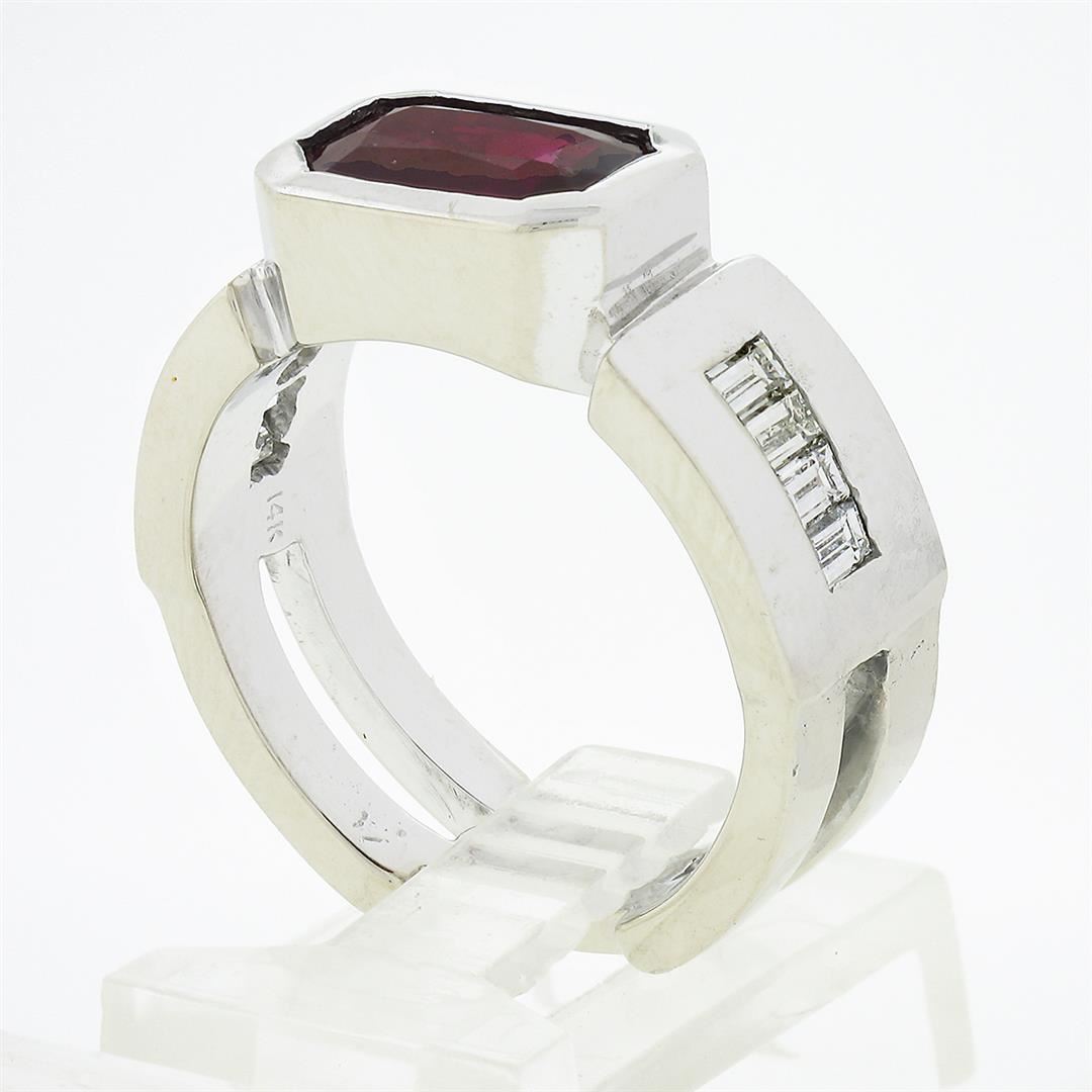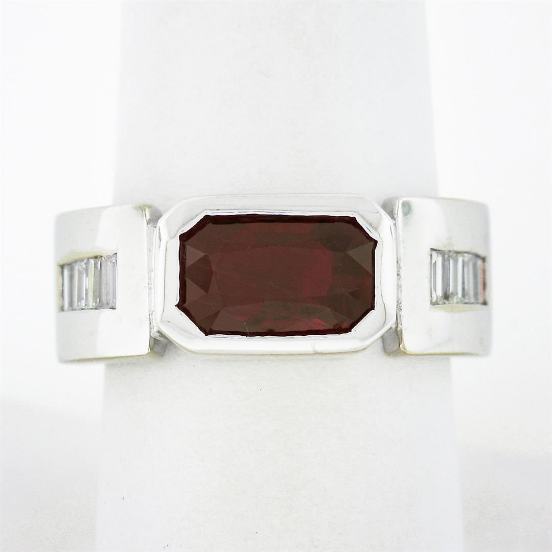 A vintage solid 14k white gold band ring, with 1 gia certified elongated octagonal step cut natural ruby (2.75ctw), and 8 baguette cut natural diamonds (G/H - VVS2/VS1 ; 0.80ctw). The ring is size 9.0, weighs a total of 12.56 grams, and measures 8.65mm wide. Comes with all original relevant certifications.