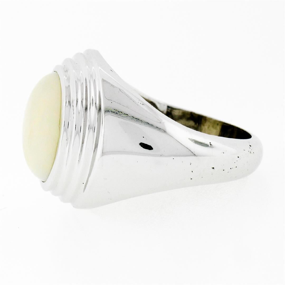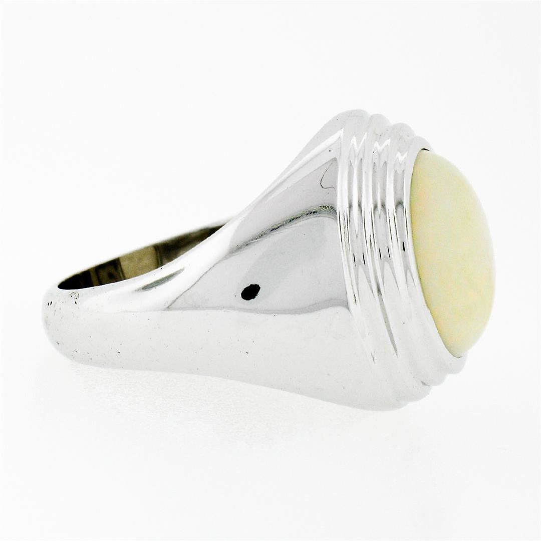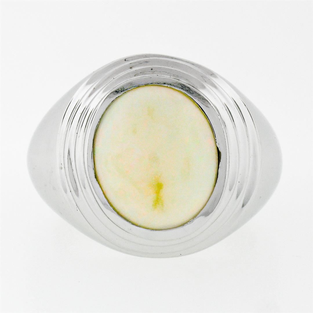 A vintage solid 14k white gold unisex solitaire ring, with 1 oval cabochon cut natural opal (11.75x10.0mm). The ring is size 6.5, weighs a total of 8.4 grams, and measures 16.85mm wide.