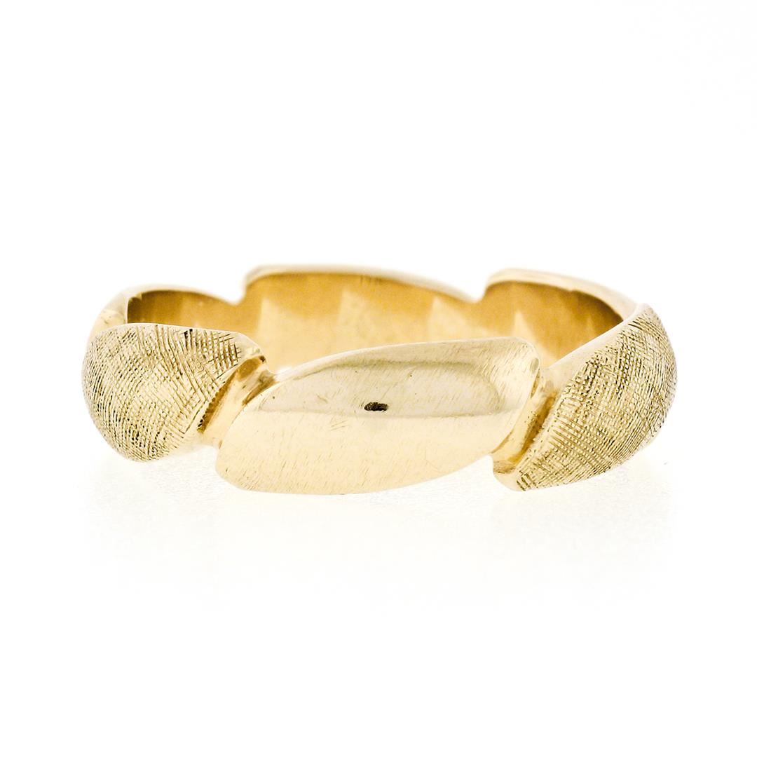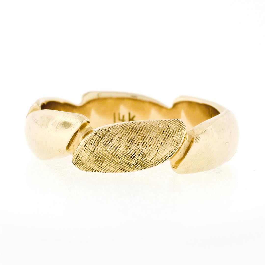 A vintage solid 14k yelliw gold grooved polished and florentine band ring. The ring is size 10, weighs a total of 6.30 grams, and measures 6.0mm wide.