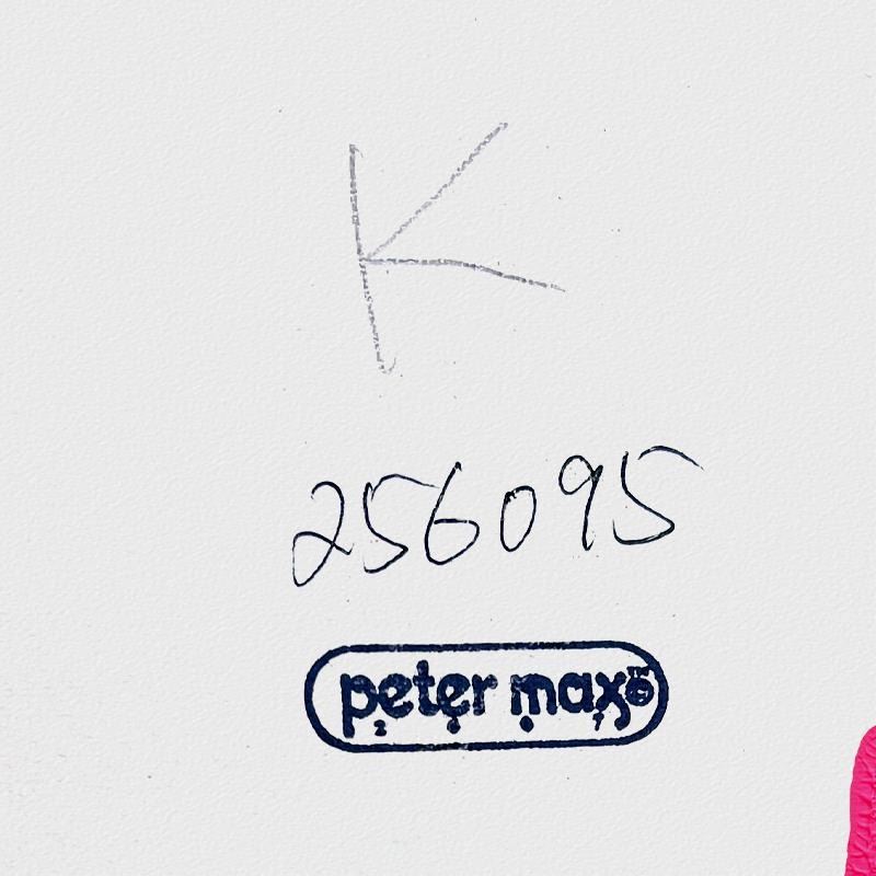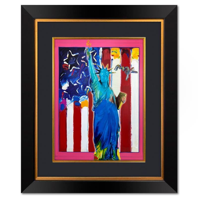 "United We Stand" is a one-of-a-kind mixed media on paper, hand signed by Peter Max. The piece comes custom framed with a backside cutout to display Peter Max Studio registration number 256095 certifying authenticity. Measures approximately 35" x 29" (frame), 24" x 18" (image).