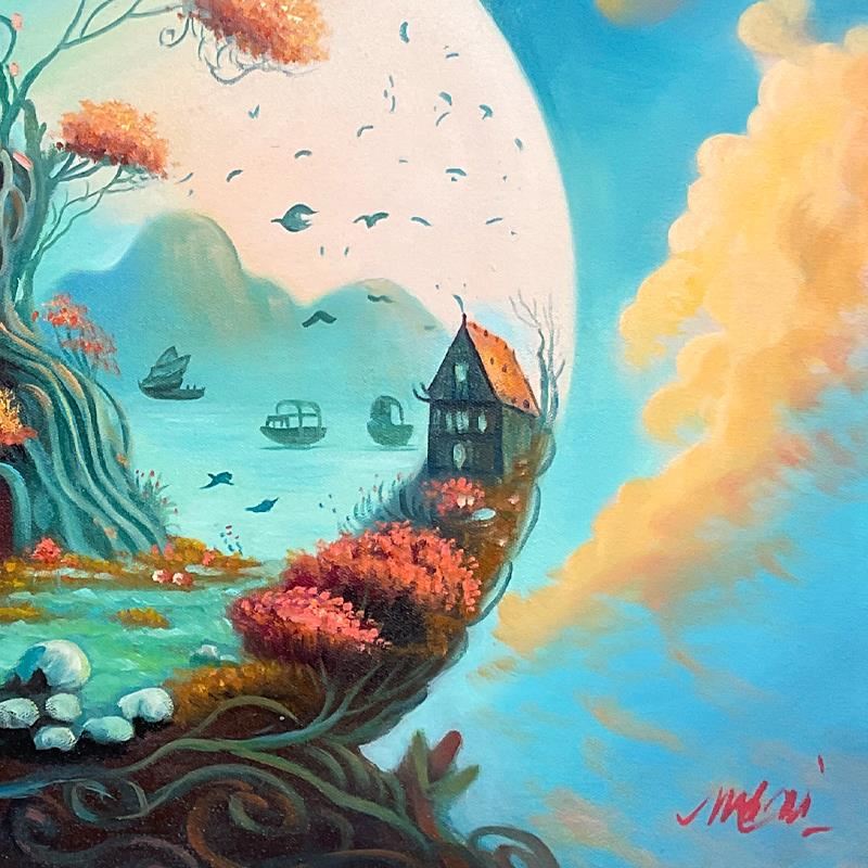 This is an original acrylic painting on canvas by Mani, hand signed by the artist. Includes Letter of Authenticity. Measures approx. 24" x 36" (image).