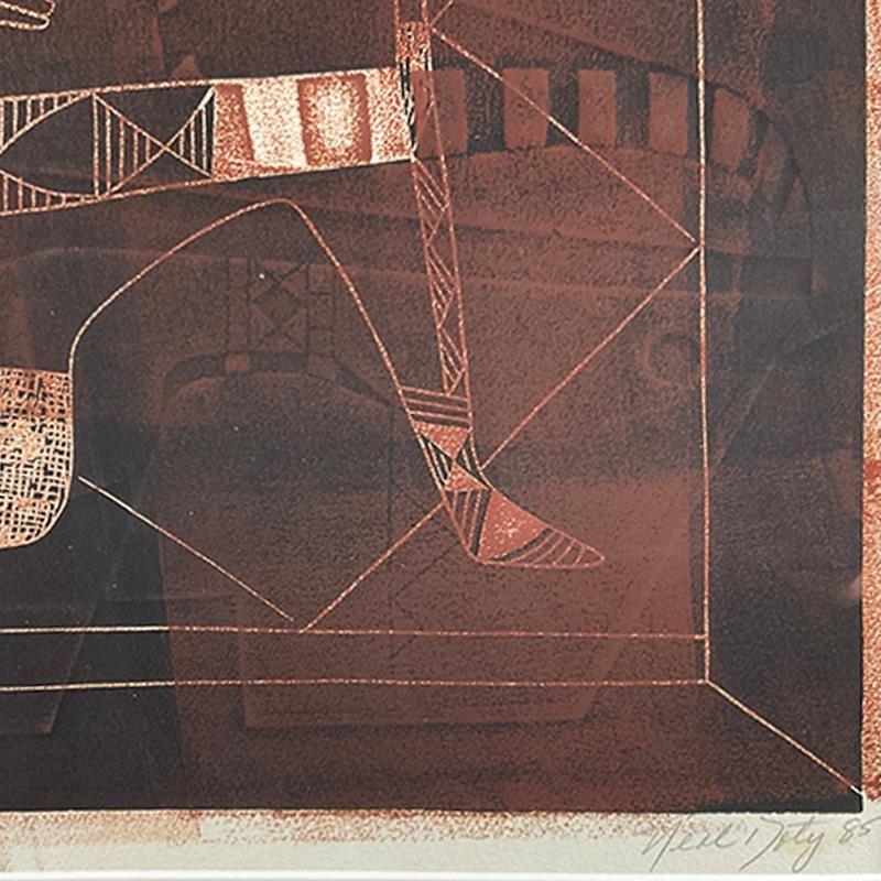 This is a one-of-a-kind linocut on paper by Neal Doty (1941-2016), dated 1985, numbered 1/1 and hand signed by the artist. This piece comes custom framed. Includes Letter of Authenticity. Measures approx. 30.5" x 25" (frame), 21" x 16" (image).