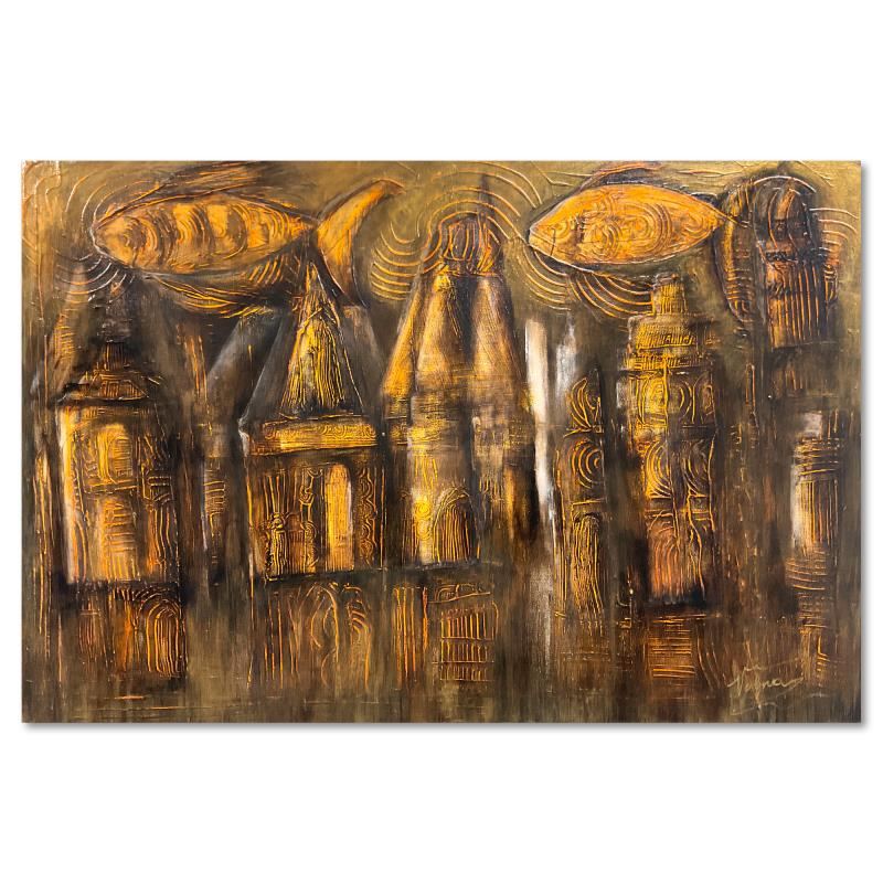 This is an original acrylic painting on stretched canvas by Nadia Volna, hand signed by the artist. This piece is painted with light-reactive black light paint that reveals brilliant colors when viewed under incandescent light. Includes Letter of Authenticity. Measures approx. 24" x 36" (image).