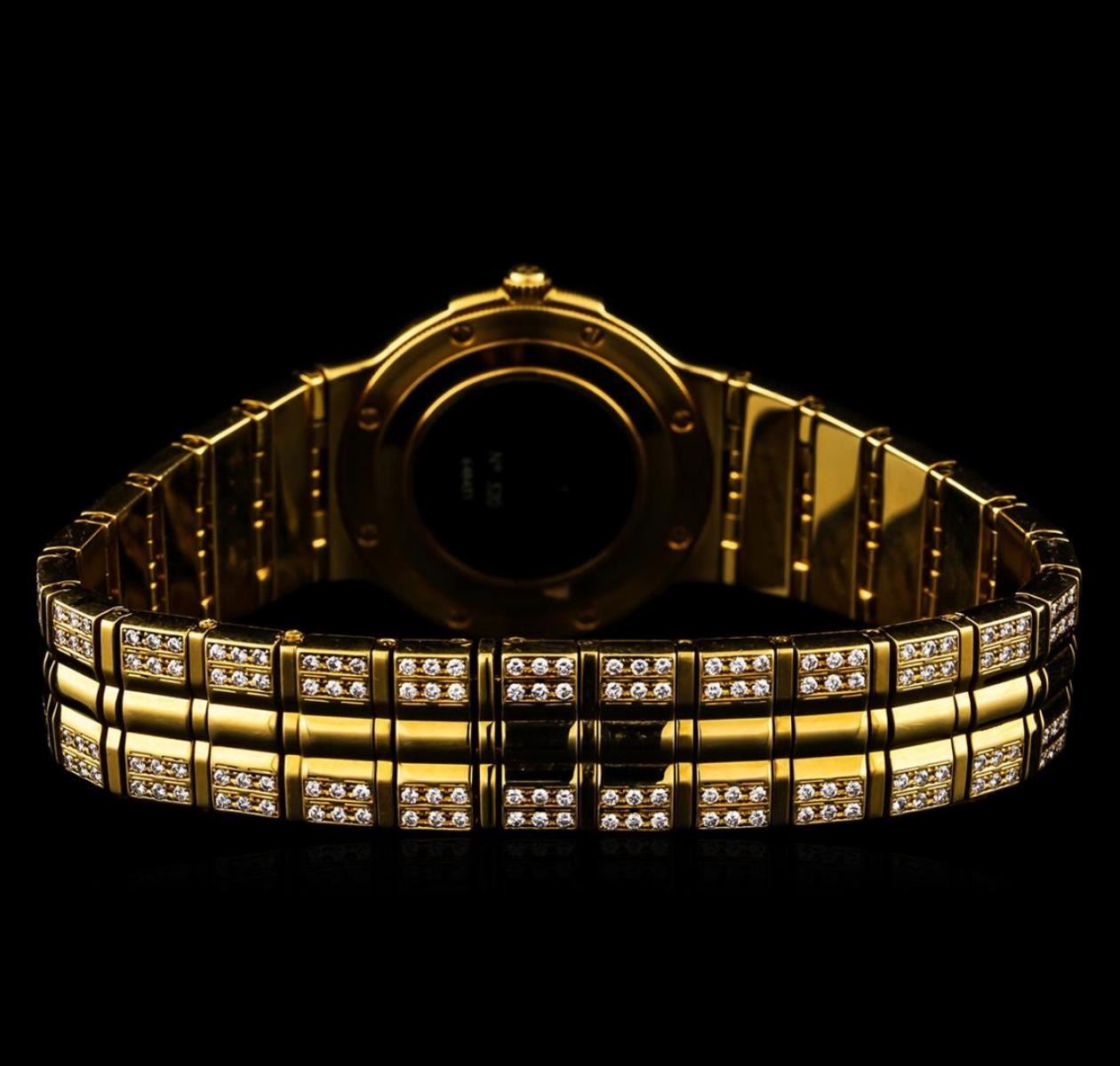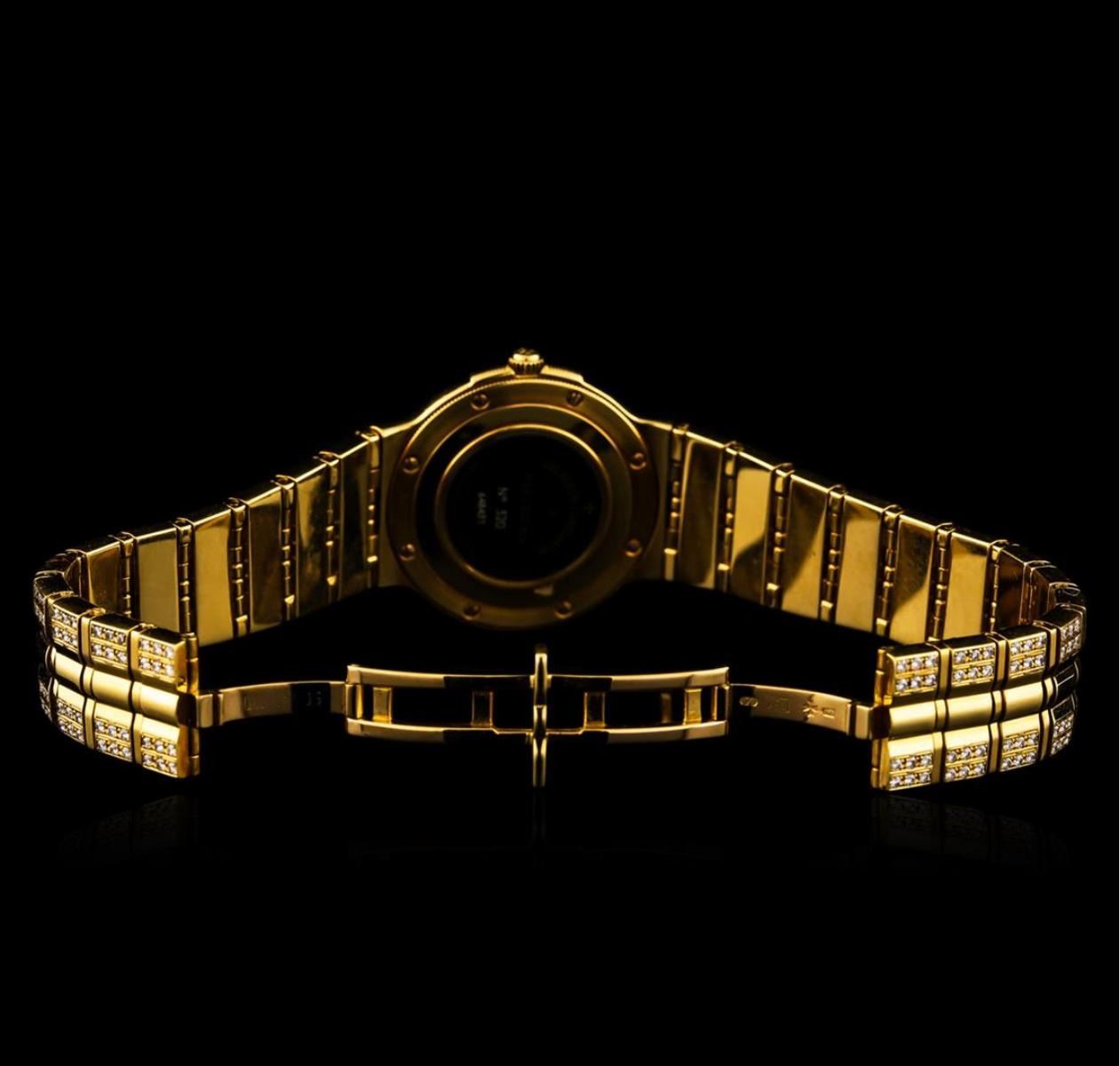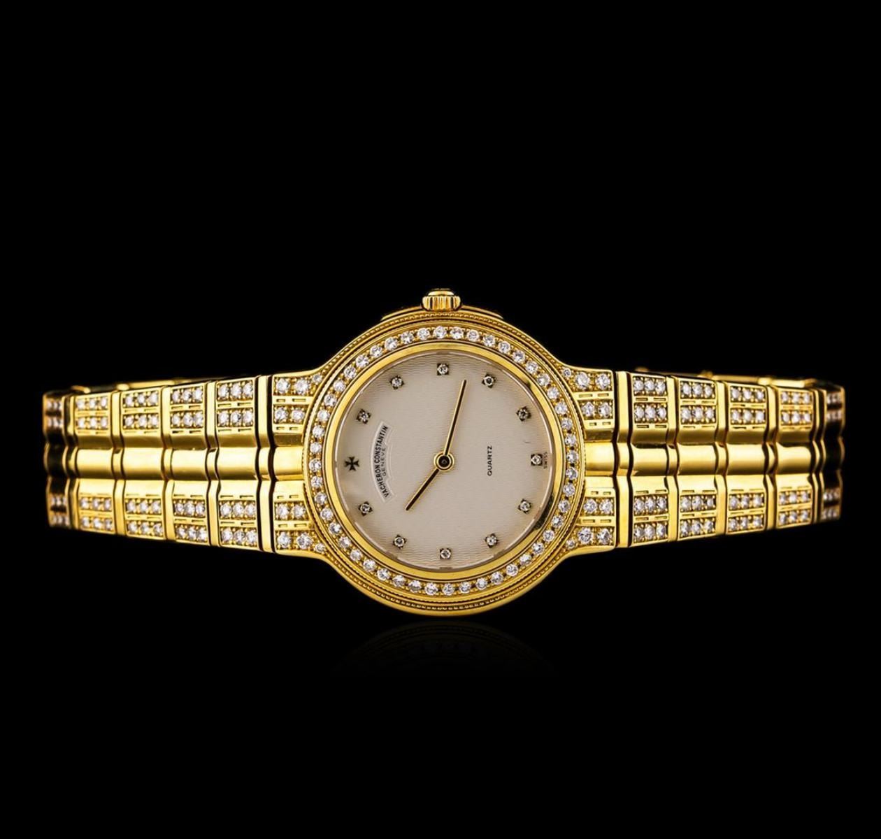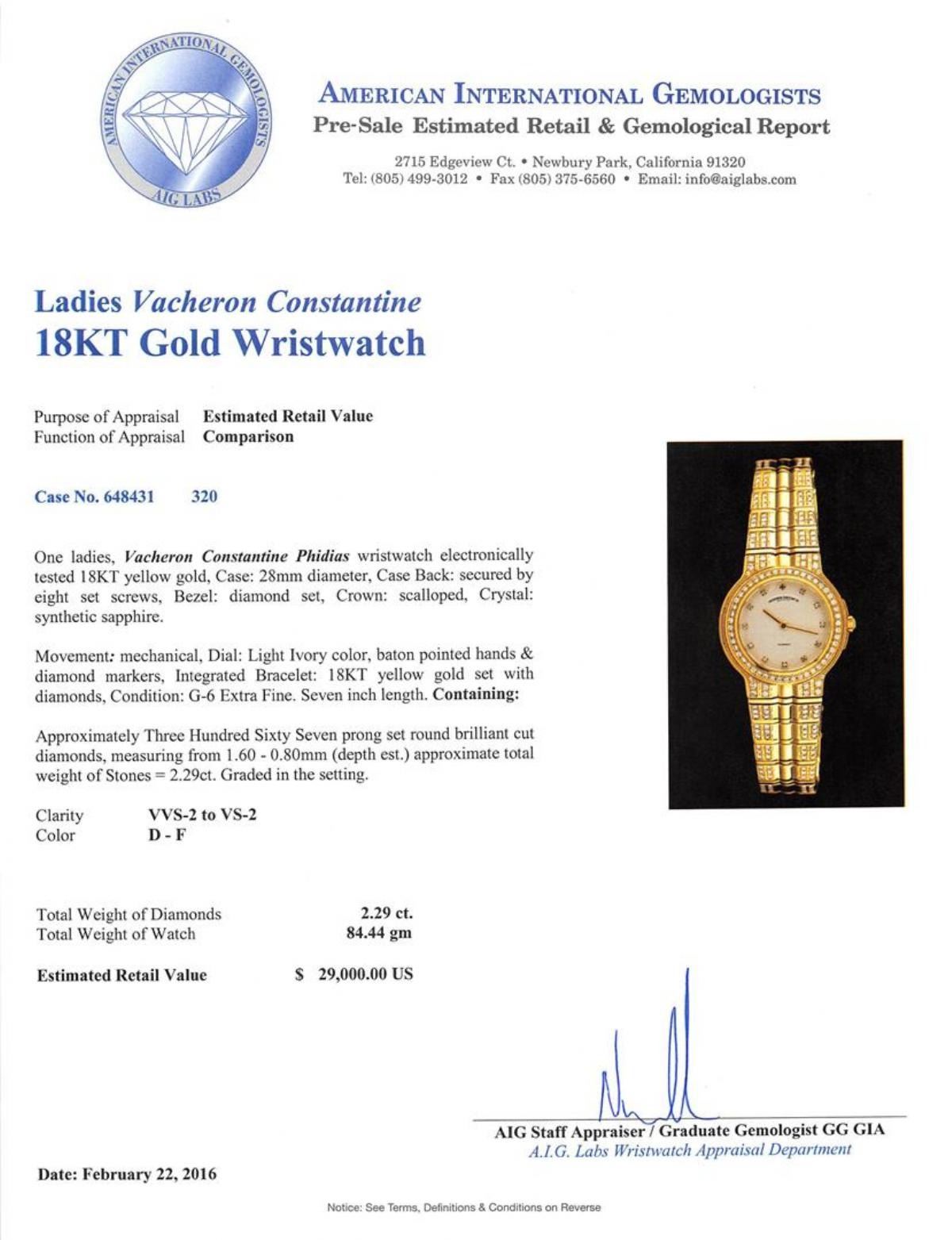 One ladies, Vacheron Constantine Phidias wristwatch electronically tested 18KT yellow gold, Case: 28mm diameter, Case Back: secured by eight set screws, Bezel: diamond set, Crown: scalloped, Crystal: synthetic sapphire. Movement: mechanical, Dial: Light Ivory color, baton pointed hands & diamond markers, Integrated Bracelet: 18KT yellow gold set with diamonds, Condition: G-6 Extra Fine. Seven inch length. Containing: Approximately Three Hundred Sixty Seven prong set round brilliant cut diamonds, measuring from 1.60 - 0.80mm (depth est.) approximate total weight of Stones = 2.29ct. Graded in the setting. Clarity: VVS-2 to VS-2. Color: D - F. Total Weight of Diamonds 2.29ct. Total Weight of Watch84.44gm. AIG Appraised at $29,000.00.